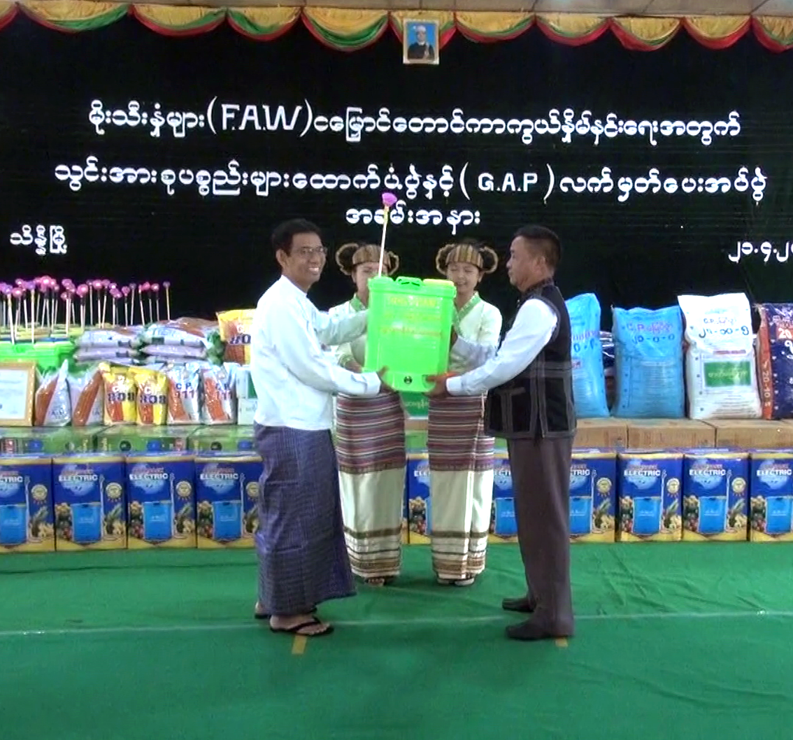 အခမ်းအနားတွင် ပြည်ထောင်စုဝန်ကြီးက ဆေးဖျန်းပုံးနှင့် ဆေးဖျန်းဝတ်စုံများနှင့် ရှမ်းပြည်နယ် စိုက်၊ မွေး၊ ဆည်ဝန်ကြီး ဦးစိုင်းလုံကျော် က ပိုးသတ်ဆေးများကို ထောက်ပံ့ ပေးအပ်ရာ တောင်သူများကိုယ်စား တာဝန်ရှိသူများက လက်ခံရယူကြသည်။