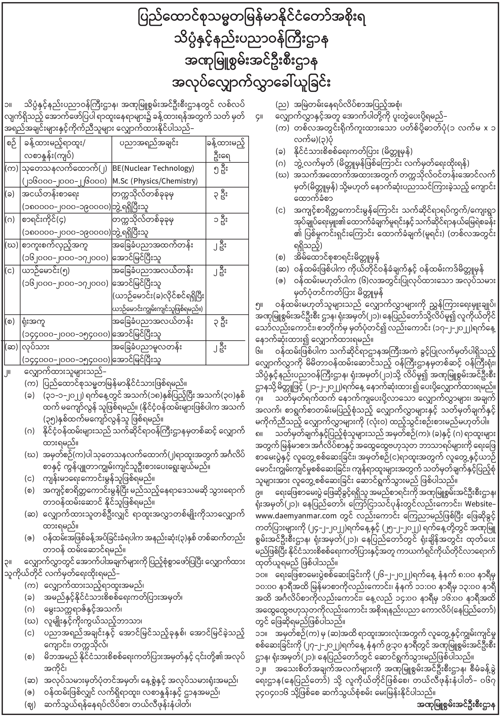 သိပ္ပံနှင့်နည်းပညာဝန်ကြီးဌာန အဏုမြူစွမ်းအင်ဦးစီးဌာန အလုပ်လျှောက်လွှာခေါ်ယူ
