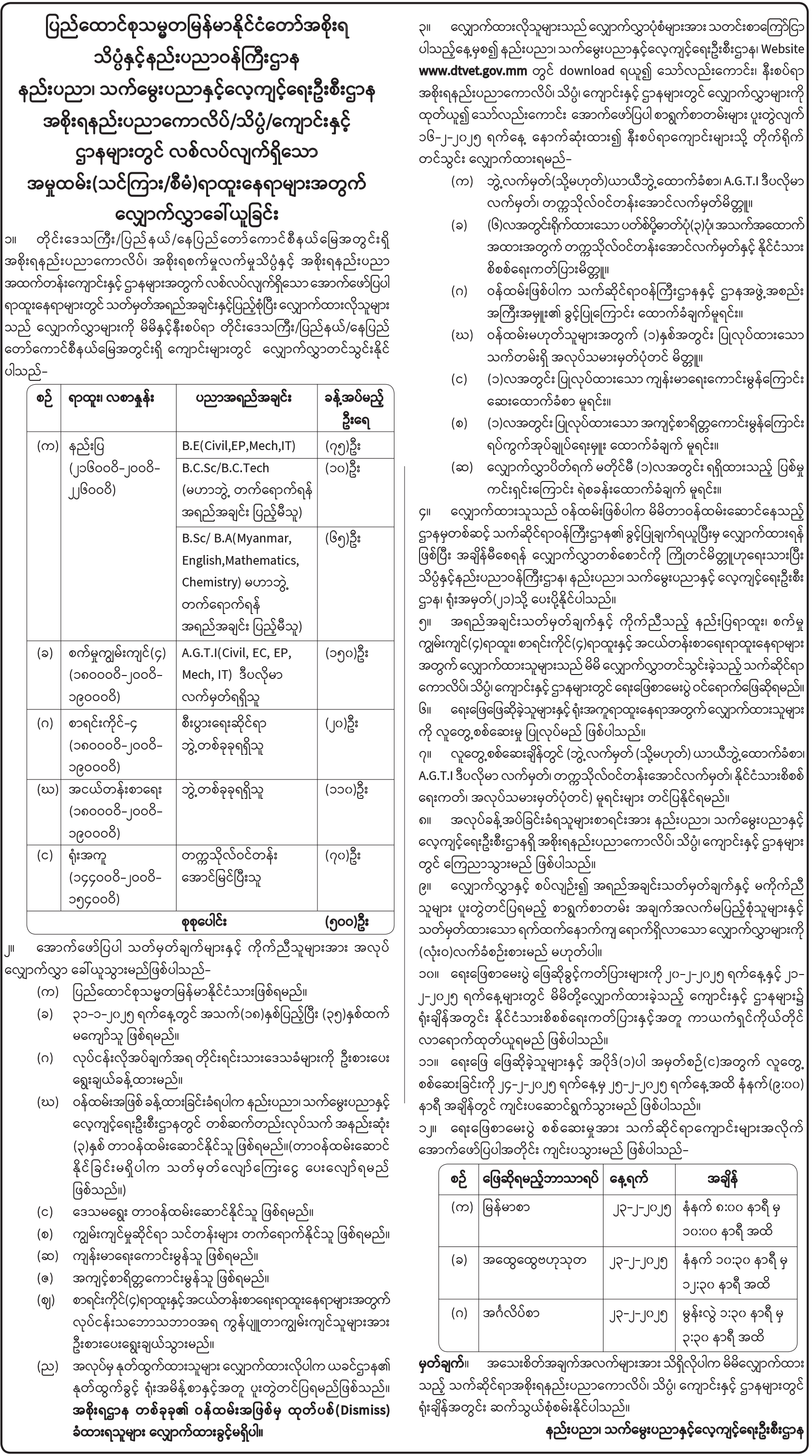 သိပ္ပံနှင့်နည်းပညာဝန်ကြီးဌာန၊ နည်းပညာ၊ သက်မွေးပညာနှင့် လေ့ကျင့်ရေးဦးစီးဌာန၊ အစိုးရနည်းပညာ ကောလိပ်/သိပ္ပံ/ကျောင်းနှင့် ဌာနများတွင် လစ်လပ်လျက်ရှိသော အမှုထမ်း (သင်ကြား/ စီမံ) ရာထူးနေရာများအတွက် လျှောက်လွှာခေါ်