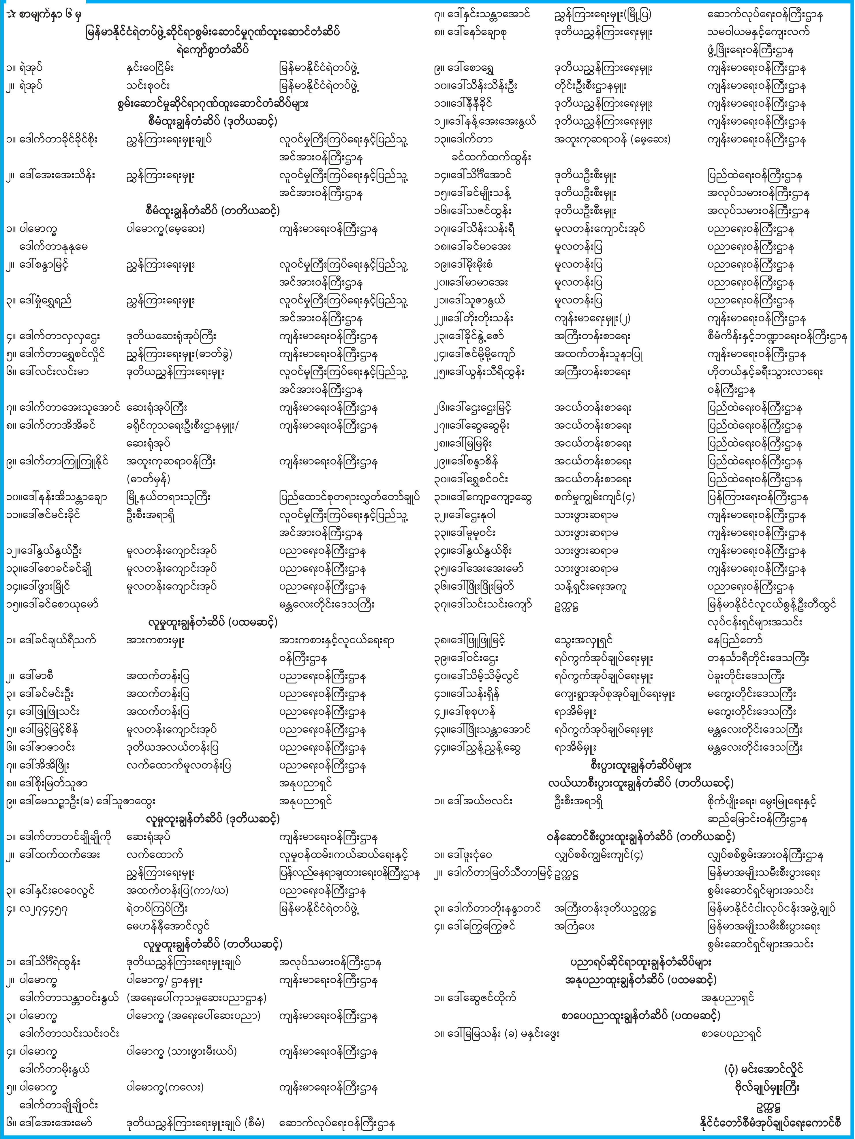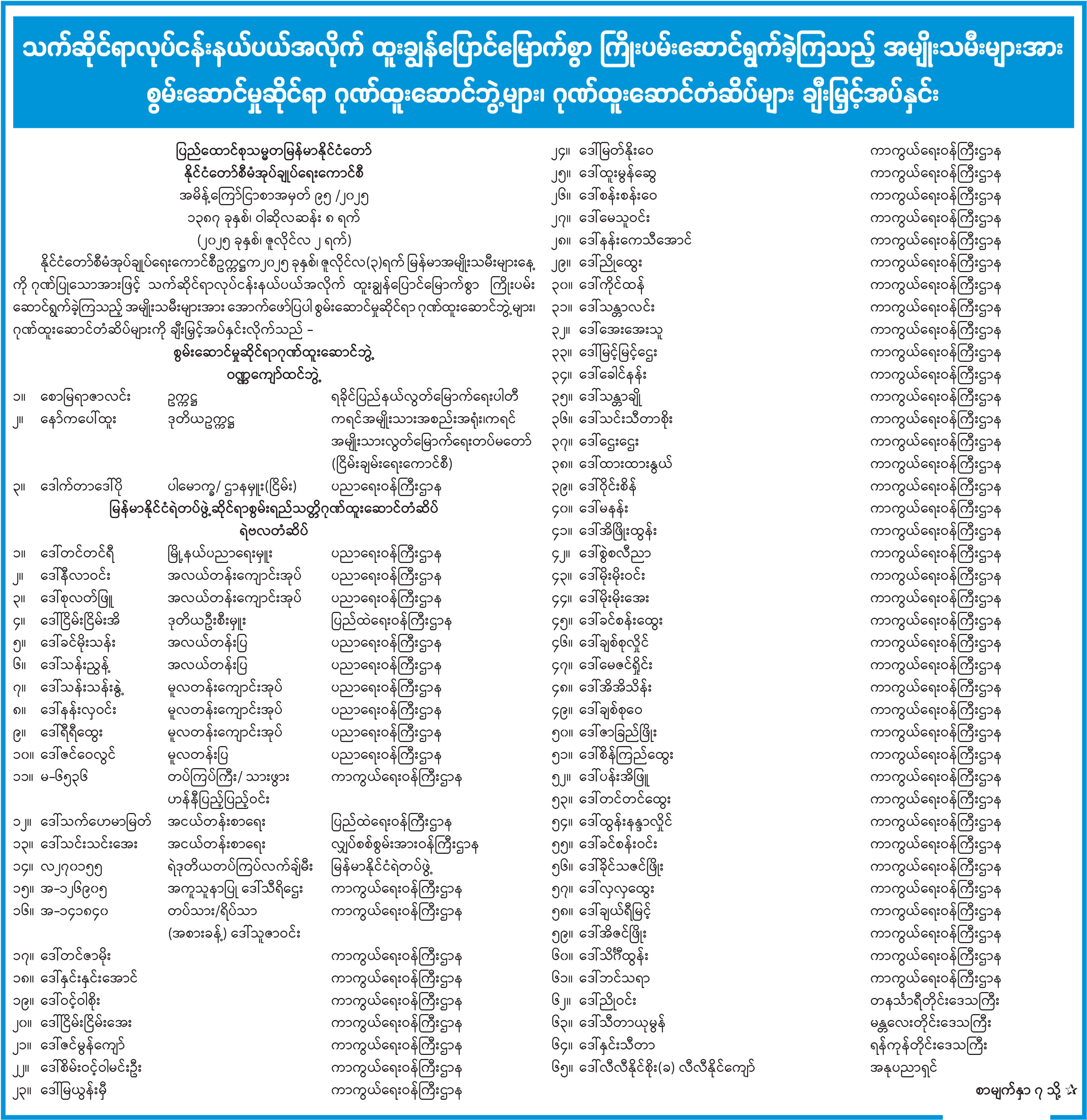 ပြည်ထောင်စုသမ္မတမြန်မာနိုင်ငံတော် ယာယီသမ္မတ နိုင်ငံတော်လုံခြုံရေးနှင့် အေးချမ်းသာယာရေး ကော်မရှင်ဥက္ကဋ္ဌ ဗိုလ်ချုပ်မှူးကြီး သတိုးမဟာသရေစည်သူ သတိုးသီရိသုဓမ္မ မင်းအောင်လှိုင်ထံမှ (၇၄) နှစ်မြောက် ကယားပြည်နယ်နေ့အခမ်းအနားသို့ပေးပို့သည့် သဝဏ်လွှာ