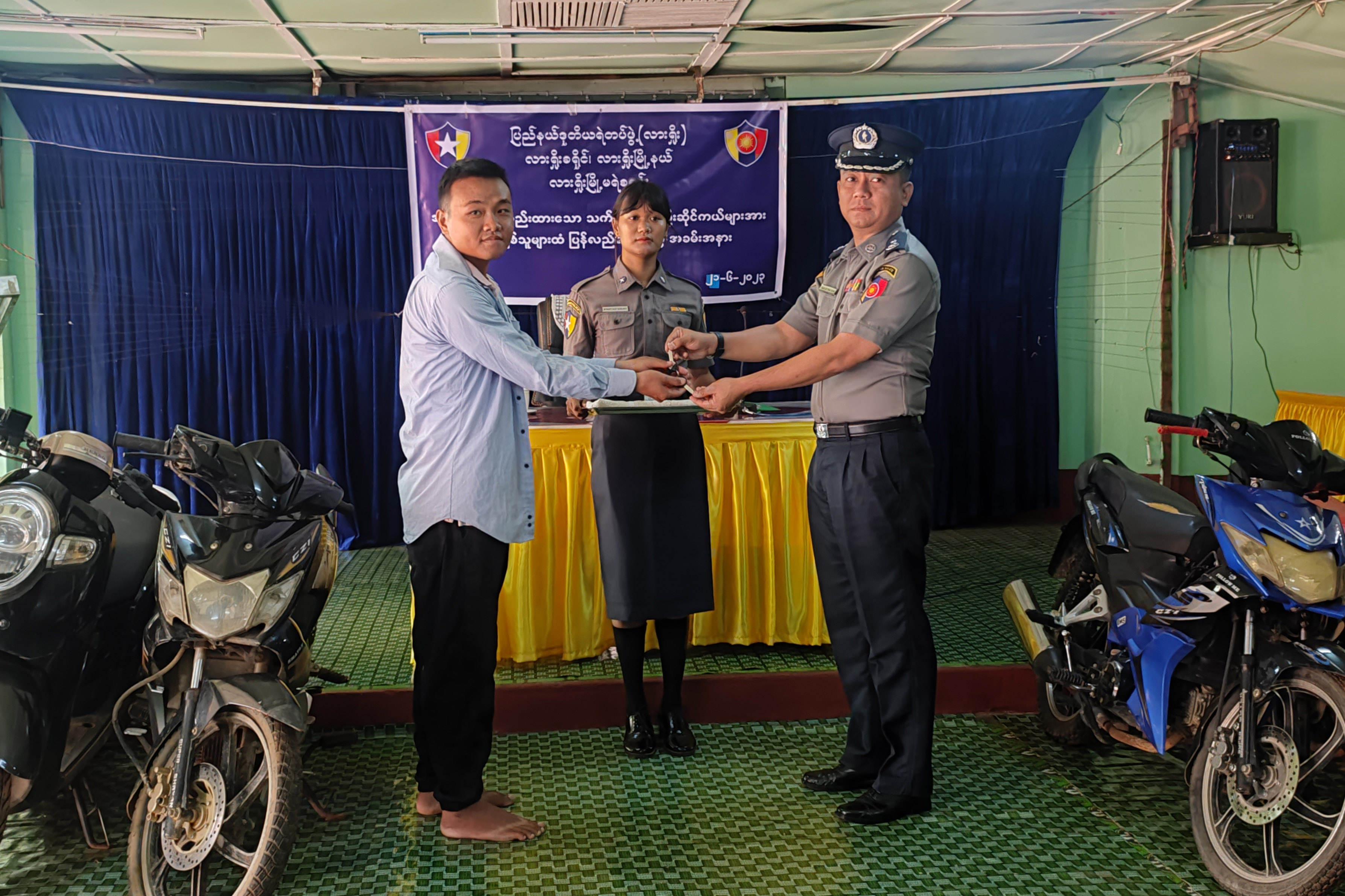 ထို့နောက် ပျောက်ဆုံးဆိုင်ကယ်များနှင့် လုယက်ခံခဲ့ရသည့်ဆိုင်ကယ်များအား လက်ခံရရှိသူများ ကိုယ်စား ဆိုင်ကယ် ပိုင်ရှင်တစ်ဦးက ကျေးဇူးတင်စကား ပြန်လည်ပြောကြားသည်။ ပျောက်ဆုံးဆိုင်ကယ်များနှင့် လုယက်ခံခဲ့ရသည့် ဆိုင်ကယ်အမှုဖြစ်စဉ်များမှ သက်သေခံပစ္စည်းများအား ပြန်လည်ပေးအပ်ခဲ့သည့် ဆိုင်ကယ်မှာ ၄၆ စီးဖြစ်ကြောင်း သိရသည်။
