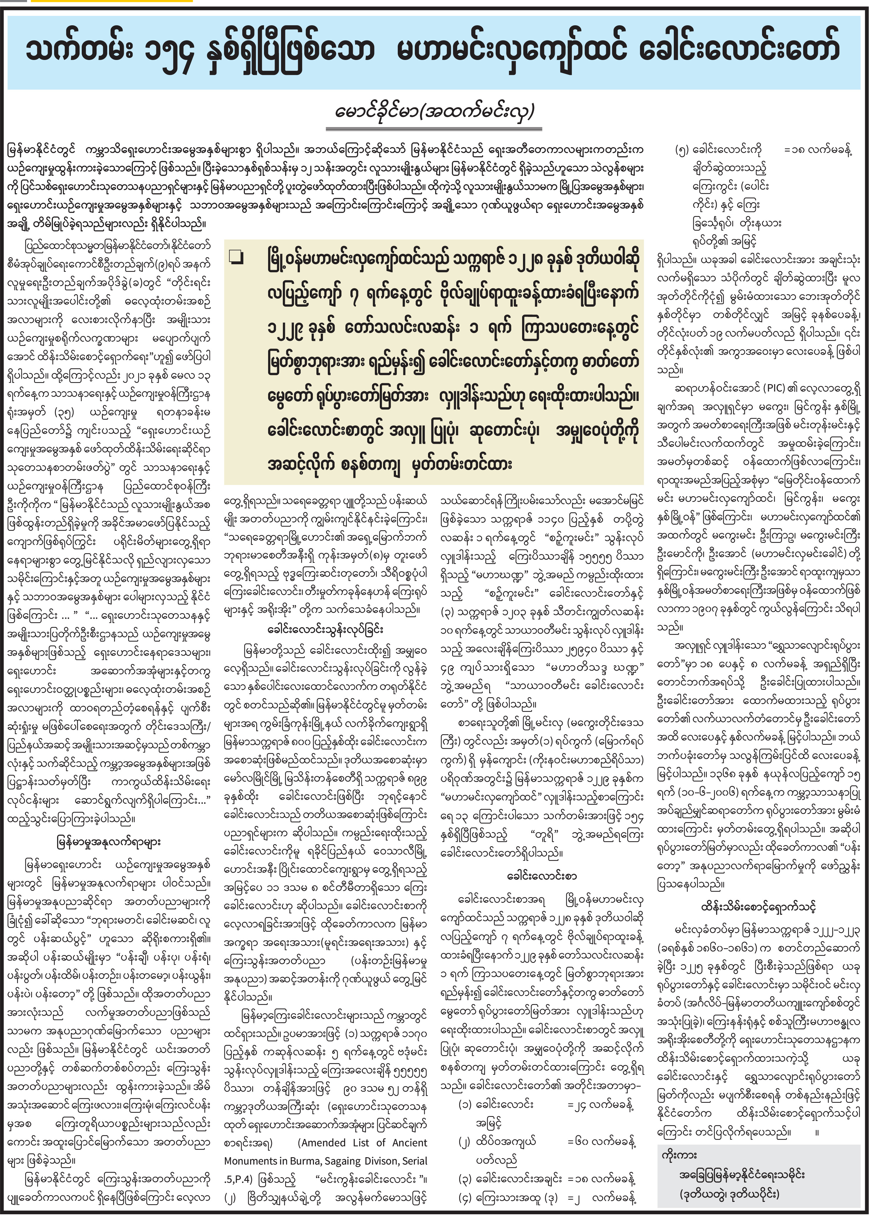 သက်တမ်း ၁၅၄ နှစ်ရှိပြီဖြစ်သော မဟာမင်းလှကျော်ထင် ခေါင်းလောင်းတော်