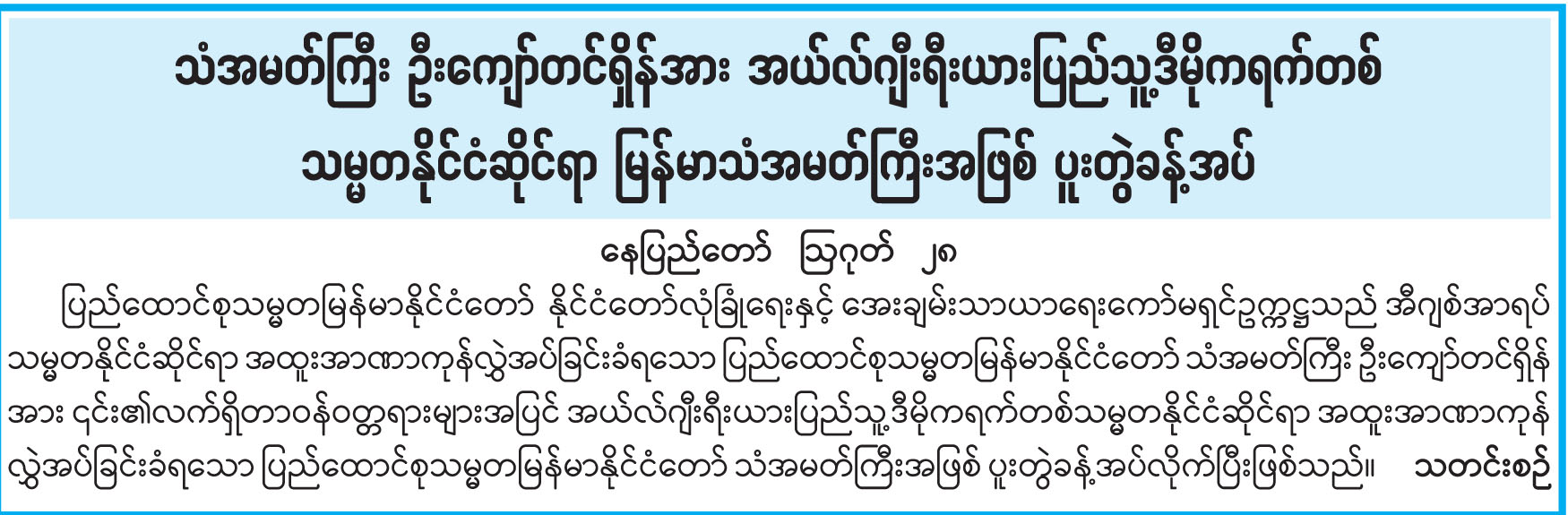 သံအမတ်ကြီး ဦးကျော်တင်ရှိန်အား အယ်လ်ဂျီးရီးယားပြည်သူ့ဒီမိုကရက်တစ် သမ္မတနိုင်ငံဆိုင်ရာ မြန်မာသံအမတ်ကြီးအဖြစ် ပူးတွဲခန့်အပ်