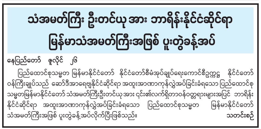သံအမတ်ကြီး ဦးတင်ယု အား ဘာရိန်းနိုင်ငံဆိုင်ရာ မြန်မာသံအမတ်ကြီးအဖြစ် ပူးတွဲခန့်အပ်