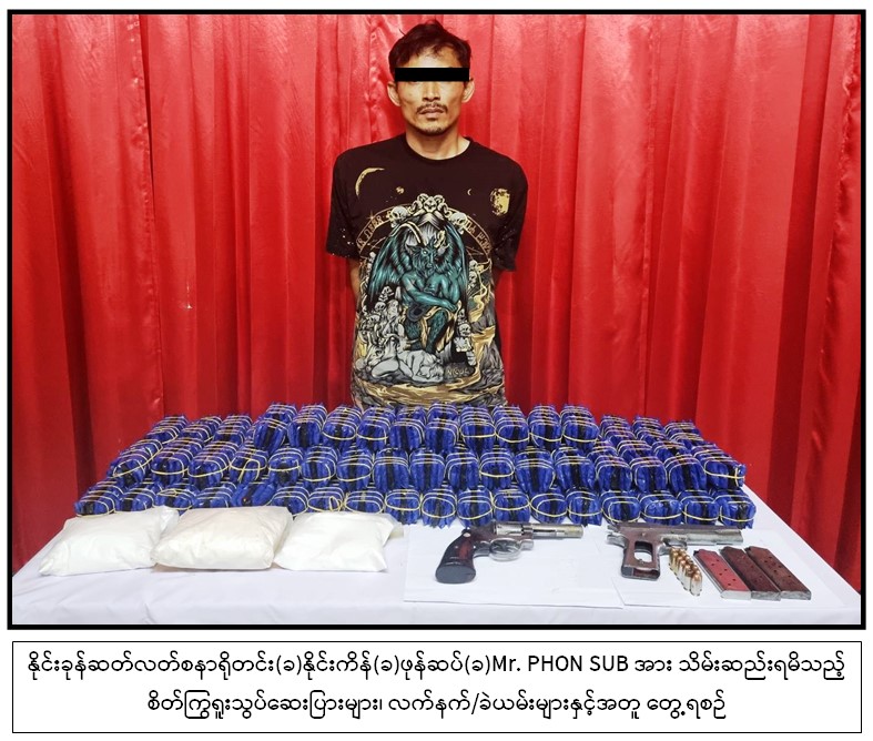 စက်တင်ဘာ ၁၀ ရက် ညနေ ၆ နာရီတွင် တာချီလိတ်မြို့၊ ဝိန်းကျောက်ရပ်ကွက်ရှိ အိမ် အမှတ်(တကက ၁၃၄/၁၀)သို့ ဝင်ရောက်ရှာဖွေရာ နိုင်းခုန်ဆတ်လတ်စနာရိုတင်း(ခ)နိုင်းကိန် (ခ) ဖုန်ဆပ်(ခ) Mr. PHON SUB ကို တွေ့ရှိရပြီး ပစ္စတိုသေနတ် ၁ လက်(မကောင်း)နှင့် ဆက်စပ် ပစ္စည်းများ၊ ၎င်းကျည်အိမ် ၃ ခု၊ 45 Auto ကျည် ၁၃ တောင့်၊ .38 Special ခြောက်လုံးပြူး သေနတ် ၁ လက်၊ စိတ်ကြွရူးသွပ်ဆေးပြား ၁၉၆,၀၀၀ စုစုပေါင်း ငွေကျပ် ၁,၃၇၂ သိန်းတန်ဖိုးရှိ စိတ်ကြွရူး သွပ်ဆေးပြားများ၊ လက်နက်/ခဲယမ်းများ ဖမ်းဆီးရမိသိမ်းဆည်းရမိခဲ့သဖြင့် ၎င်းတို့အား မူးယစ် ဆေးဝါးနှင့်စိတ်ကိုပြောင်းလဲ စေသောဆေးဝါးများဆိုင်ရာ ဥပဒေအရ အရေးယူထားကြောင်း သိရသည်။