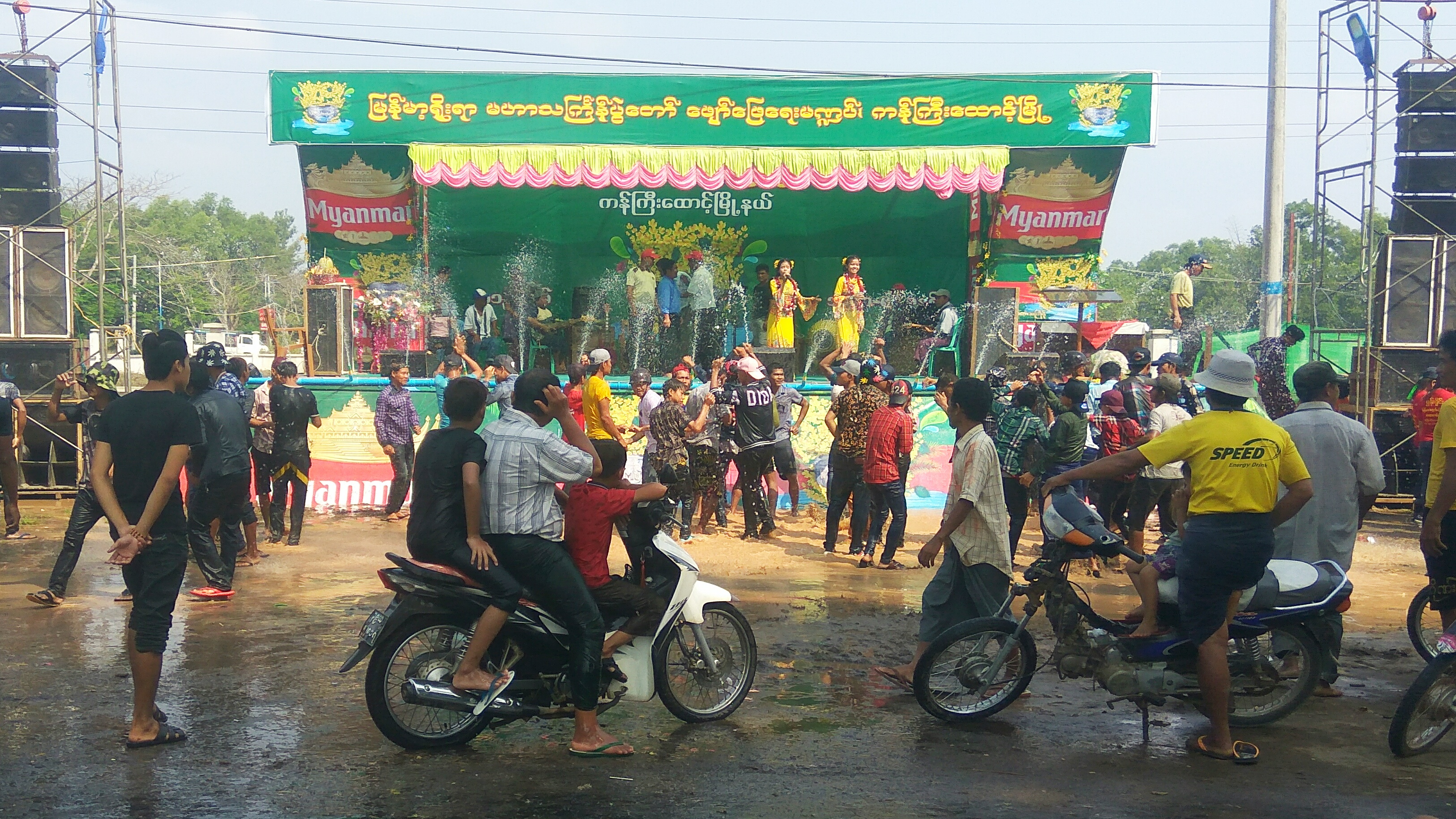 သင်္ကြန်အကြတ်နေ့ ဧရာဝတီတိုင်းဒေသကြီး၊ ကန်ကြီးထောင့်မြို့ ဗဟိုသင်္ကြန်မဏ္ဍပ်၌ ရေကစားသူများ၊ ရေပက်ခံသူများ၊ တေးဂီတနှင့် ယိမ်းအက ဖျော်ဖြေမှုများဖြင့် စည်းကားလျက်ရှိ