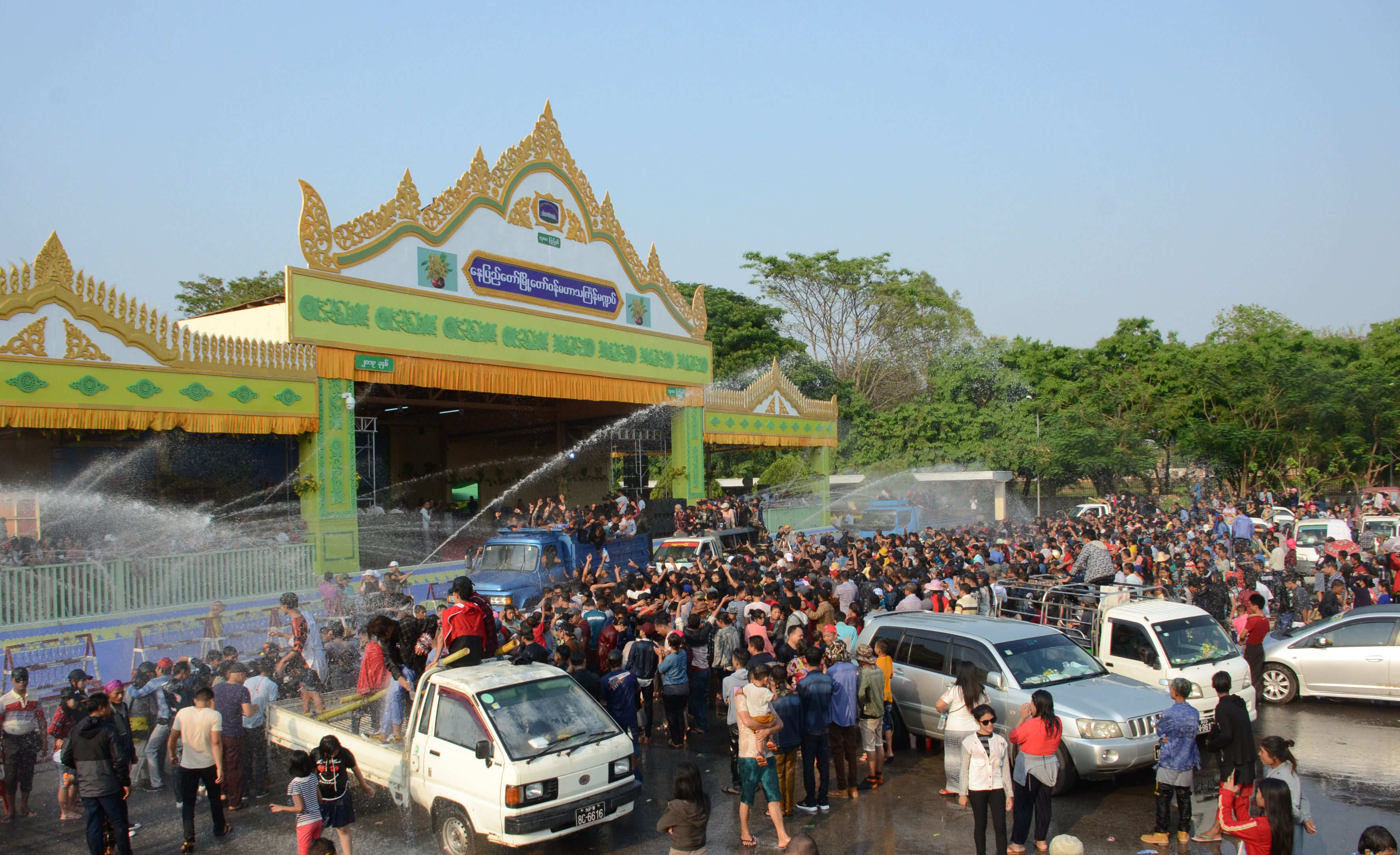 သင်္ကြန်အတက်နေ့ နေပြည်တော် မြို့တော်ဝန်မဏ္ဍပ်တွင် ရေပက်သူများနှင့် ရေပက်ခံထွက်သူများဖြင့် စည်ကားနေ