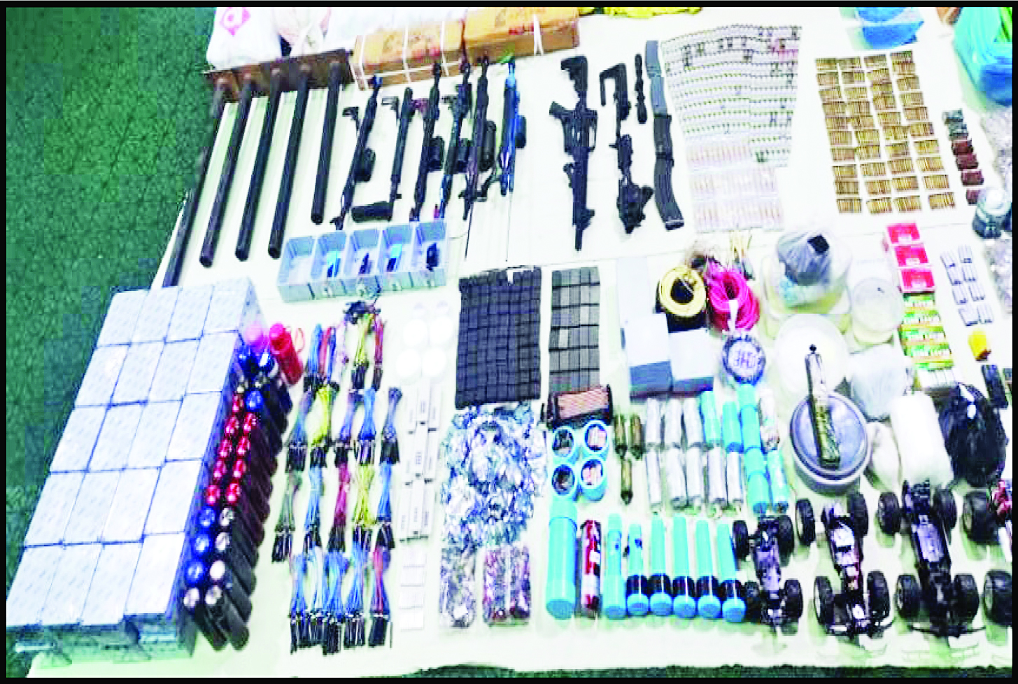 ဖြစ်စဉ်တွင် တရားခံအမျိုးသား ၁၄ ဦး၊ အမျိုးသမီးနှစ်ဦး ပေါင်း ၁၆ ဦးတို့ကို M-16 တစ်လက်၊ MK-12 တစ်လက်၊ ပွိုင့်-22 တစ်လက်၊ လက်လုပ်သေနတ် ကိုးလက်၊ လက်လုပ်မိုင်းမျိုးစုံ ၂၁ လုံး၊ ကျည်မျိုးစုံ ၁၇၆၅ တောင့်၊ ကျည်အိမ် လေးခု၊ MK-12 ပြောင်းကာတစ်ခု၊ MK-12 ဒင်တစ်ခု၊ မှန်ပြောင်းနှစ်လက်၊ အသံတိတ် ပြောင်းတစ်ခု၊ ဒီတိုနေတာ အချောင်း ၅၀၀၊ အဝေးထိန်းခလုတ် ခုနစ်ခု၊ ယမ်းချောင်း ၈၀ ၊ လက်လုပ်သေနတ်နှင့် လက်လုပ်မိုင်းပြုလုပ်ရာတွင် အသုံးပြု သည့် ဆက်စပ်ပစ္စည်းများနှင့်အတူ ဖမ်းဆီးရမိခဲ့သည်။