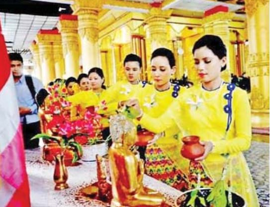 ရေလောင်းမဏ္ဍပ်ထဲတွင် လှေထည့်ထားပြီး ရေဖြည့်ကာ အမျိုးသားနှင့် အမျိုးသမီးတို့ တစ်ယောက်ကိုတစ်ယောက် အပြန်အလှန်ရေလောင်းကြသော ရခိုင်ရိုးရာ သင်္ကြန်ကို မြန်မာနိုင်ငံတွင် လူသိများသည်။ ရခိုင်ဒေသတွင် သင်္ကြန်မကျမီ သင်္ကြန်အကြိုပွဲကို တခမ်းတနားပြုလုပ်ကြသည်။ တစ်နည်းပြောရလျှင် နံ့သာသွေးပွဲနှင့် ဘုရားရေချိုး(ရေသပ္ပာယ်ပွဲ)ဖြစ်သည်။ ဘုရားရေချိုး (ရေသပ္ပာယ်ပွဲ)ကို သင်္ကြန်အကျရောက်မှ ကျင်းပလေ့ရှိသည်။ ရခိုင်တို့က ဘုရားရေသပ္ပာယ်သည်ကို ဘုရားရေချိုးသည်ဟု သုံးနှုန်းပြောဆိုကြသည်။ သင်္ကြန်အကြိုညက သွေးယူထားသော နံ့သာရည်များကို နံ့သာခွက်ကလေးများ တွင်ထည့်၍ မိန်းမငယ်များက ကိုယ်စီကိုင်၍ စီတန်းလျှောက်ကြသည်။ မိန်းမကြီး၊ မိန်းမလတ်၊ မင်းကျွန်မ (အိမ်ထောင်ကျပြီးသူ)များက ဆွမ်းအုပ်များ ကိုယ်စီခေါင်းပေါ်တွင်ပင့်ချီရင်း ဘုရားရေချိုးမည့် ဘုန်းတော်ကြီး ကျောင်းသို့ လိုက်ပါစီတန်းလျှောက်ကြသည်။ မင်းကျွန်(အိမ်ထောင်ကျပြီးသူ)များက အလှူပစ္စည်းများ၊ တံခွန်ကုက္ကားများကိုင်၍ ဘုရားရေချိုးရန် သွားကြသည်မှာ အလွန်ကြည်နူးဖွယ်ကောင်းသော မြင်ကွင်းတစ်ခု ဖြစ်နေသည်။ ကာလသားလူငယ်များက မရိုးနိုင်သော ရခိုင်ရိုးရာသင်္ကြန်သီချင်းများ၊ သံချပ်များကို ဆိုတီးကခုန်လိုက်ပါ ကြသည်။ သင်္ကြန်ကာလ အပျို၊ လူပျိုများအဖို့ သင်္ကြန်မဏ္ဍပ်၌ ရေလောင်းရင်း ဖူးစာဖက်ဆုံတတ်ကြ၍ အတက်ကြွဆုံး၊ အမြူးကြွဆုံး၊ အပျော်ဆုံးကာလတစ်ခုဖြစ်သည်။