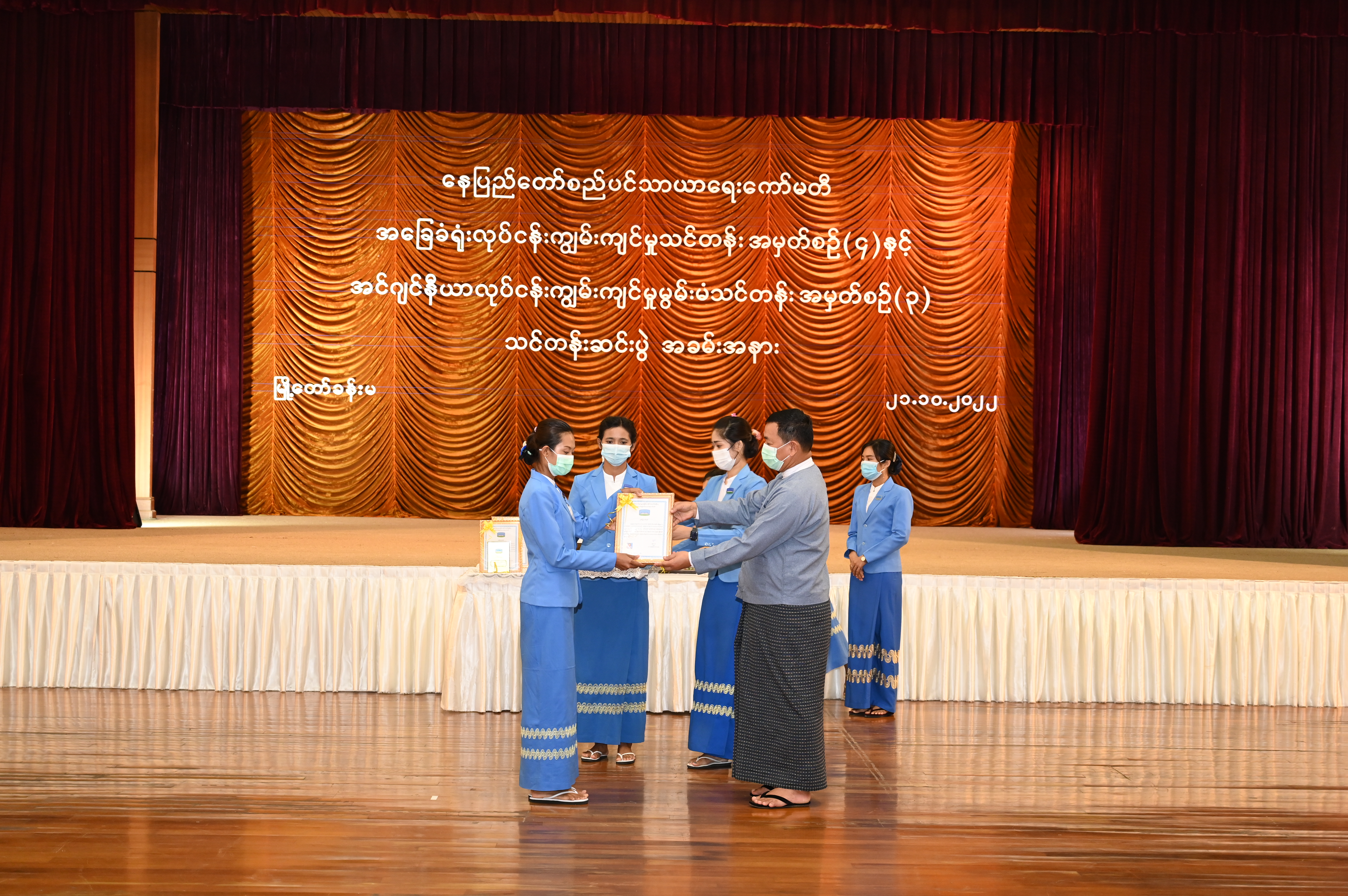ယင်းနောက် ဒုတိယမြို့တော်ဝန်နှင့် တာဝန်ရှိသူများက သင်တန်းအလိုက် ထူးချွန် ဆုရရှိသော သင်တန်းသား သင်တန်းသူများကို တစ်ဦးချင်းဆုတံဆိပ်များနှင့် သင်တန်းသား ကိုယ်စားလှယ်များထံ သင်တန်းဆင်းလက်မှတ်များ ပေးအပ်ခဲ့ကြောင်း သိရသည်။