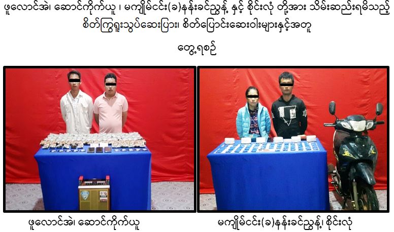 မေ ၁၄ ရက် မွန်းလွဲ ၃ နာရီခွဲတွင် နောင်ချိုမြို့၊ ပါဟတ်ရပ်ကွက်၊ အိုရီယမ် တယ်တိုးဂိတ်အနီးတွင် Nissan AD Van အမျိုးအစား ခရီးသည်တင်မော်တော်ယာဉ်ကို ရပ်တန့်စစ် ဆေးရှာဖွေရာ စိတ်ပြောင်းဆေးဝါး (Happy Water) ၄ ဒသမ ၅ ကီလို သိမ်းဆည်း ရမိခဲ့ကြောင်း၊ အလားတူ မေ ၁၄ ရက် ညနေ ၄ နာရီတွင် နောင်ချိုမြို့၊ ပါဟတ်ရပ်ကွက်၊ အိုရီယမ်တယ် တိုးဂိတ်အနီးတွင် စိုင်းလုံ မောင်းနှင်ပြီး မကျိုမ်ငင်း(ခ)နန်းခင်ညွန့် လိုက်ပါလာသည့်မော်တော်ဆိုင် ကယ် ကို ရပ်တန့်စစ်ဆေးရှာဖွေရာ စိတ်ကြွရူးသွပ်ဆေးပြား ၂၂,၀၀၀ ကိုလည်းကောင်း သိမ်းဆည်းရ မိခဲ့သဖြင့် ၎င်းတို့အား မူးယစ်ဆေးဝါးနှင့် စိတ်ကိုပြောင်းလဲစေသော ဆေးဝါးများဆိုင်ရာ ဥပဒေအရ အရေးယူထားကြောင်း သိရသည်။
