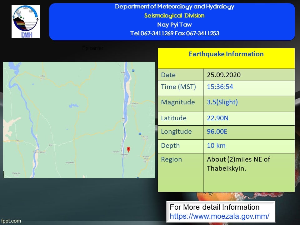 ၂၀၂၀ ပြည့်နှစ်၊ စက်တင်ဘာလ (၂၅)ရက်နေ့၊ မြန်မာစံတော်ချိန် မွန်းလွဲ ၃ နာရီ (၃၆)မိနစ်၊ (၅၄)စက္ကန့် တွင် ကန့်ဘလူမြေငလျင်စခန်းမှ အရှေ့တောင်ဘက် (၃၇) မိုင်ခန့် ကွာဝေးသော၊ မြန်မာနိုင်ငံပြည်တွင်း (သပိတ်ကျင်းမြို့၏ အရှေ့မြောက်ဘက် (၂)မိုင်ခန့် အကွာ)၊ မြောက်လတ္တီတွဒ် (၂၂.၉၀) ဒီဂရီ၊ အရှေ့လောင်ဂျီတွဒ် (၉၆.၀၀)ဒီဂရီ၊ အနက် (၁၀)ကီလိုမီတာကို ဗဟိုပြု၍ အင်အားရစ်(ခ်)တာစကေး (၃.၅) အဆင့်ရှိ အင်အားအနည်းငယ်ရှိသော မြေငလျင် တစ်ခု လှုပ်ရှားသွားကြောင်း တိုင်းထွာရရှိပါသည်။