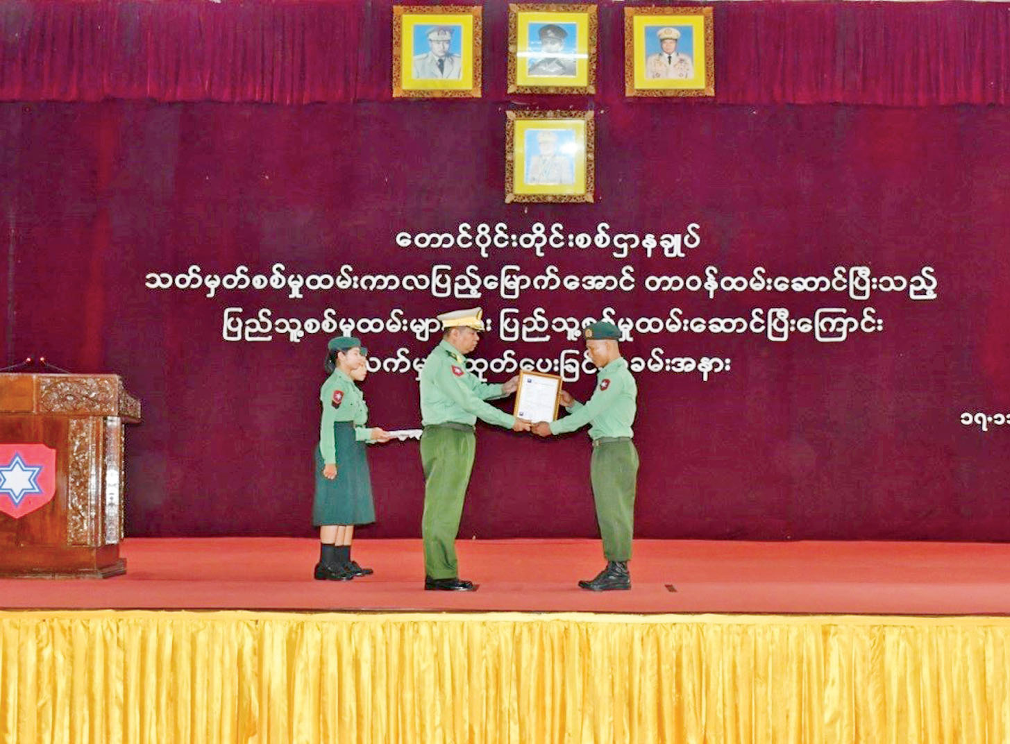 ဦးစွာ တိုင်းမှူးက ဂုဏ်ပြုအမှာစကား ပြောကြားသည်။ ထို့နောက် တိုင်းမှူးနှင့် တာဝန်ရှိသူများက သတ်မှတ်စစ်မှုထမ်း ကာလပြည့်မြောက်အောင် တာဝန်ထမ်းဆောင်ပြီးသည့် ပြည်သူ့စစ်မှုထမ်း များအား ပြည်သူ့စစ်မှုထမ်းဆောင်ပြီးကြောင်း လက်မှတ်များ ပေးအပ်ချီးမြှင့်ကြသည်။