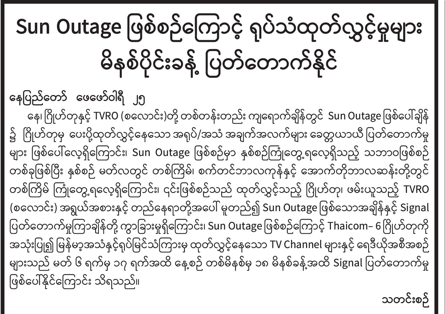 Sun Outage ဖြစ်စဉ်ကြောင့် ရုပ်သံထုတ်လွှင့်မှုများ မိနစ်ပိုင်းခန့် ပြတ်တောက်နိုင်