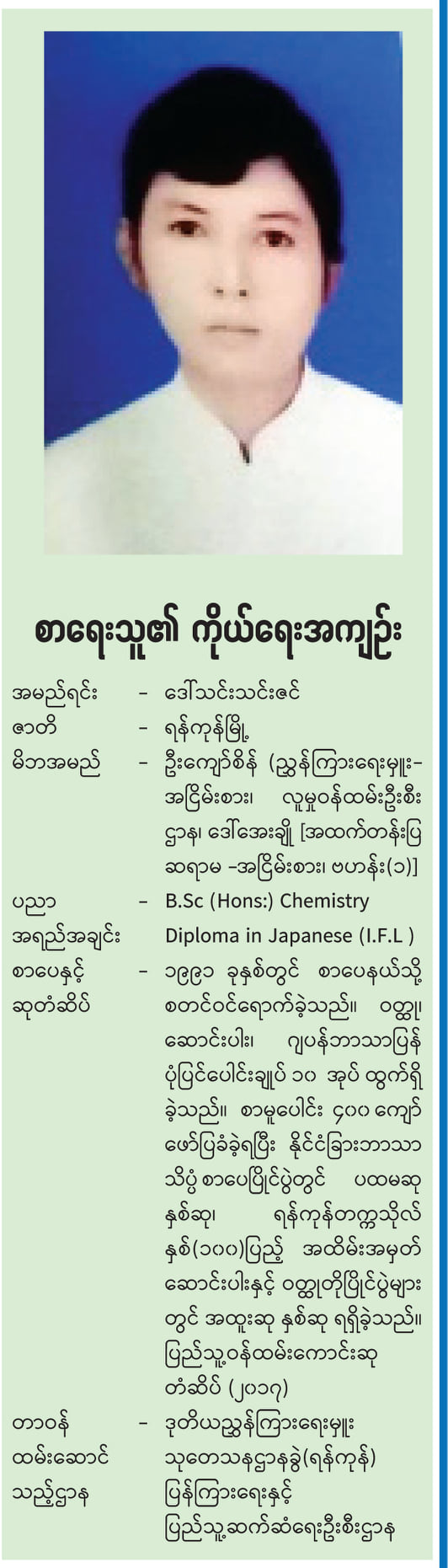 ကျွန်မ ရန်ကုန်တက္ကသိုလ်တွင် ဂုဏ်ထူးတန်းတက်ရောက် ခွင့်ရရှိကြောင်း သိလိုက်ရချိန်မှာ ပျော်လိုက်သည်ဖြစ်ခြင်း၊ အမှန်တော့ ဟိုးငယ်စဉ် ကလေးဘဝကတည်းက ဘွဲ့နှင်းသဘင်ခန်းမကြီးမှာ ဘွဲ့တက်ရောက်ယူကြသော အစ်ကို၊ အစ်မဝမ်းကွဲများ၏ ဓာတ်ပုံများကို ငေးမော ကြည့်ရှုရင်း တစ်နေ့နေ့ တစ်ချိန်ချိန်မှာ မိမိကိုယ်တိုင် ဘွဲ့နှင်းသဘင်ခန်းမကြီးထဲ တက်ရောက်ဘွဲ့ယူလိုစိတ်က တဖွားဖွားဖြစ်တည်ခဲ့သည်။