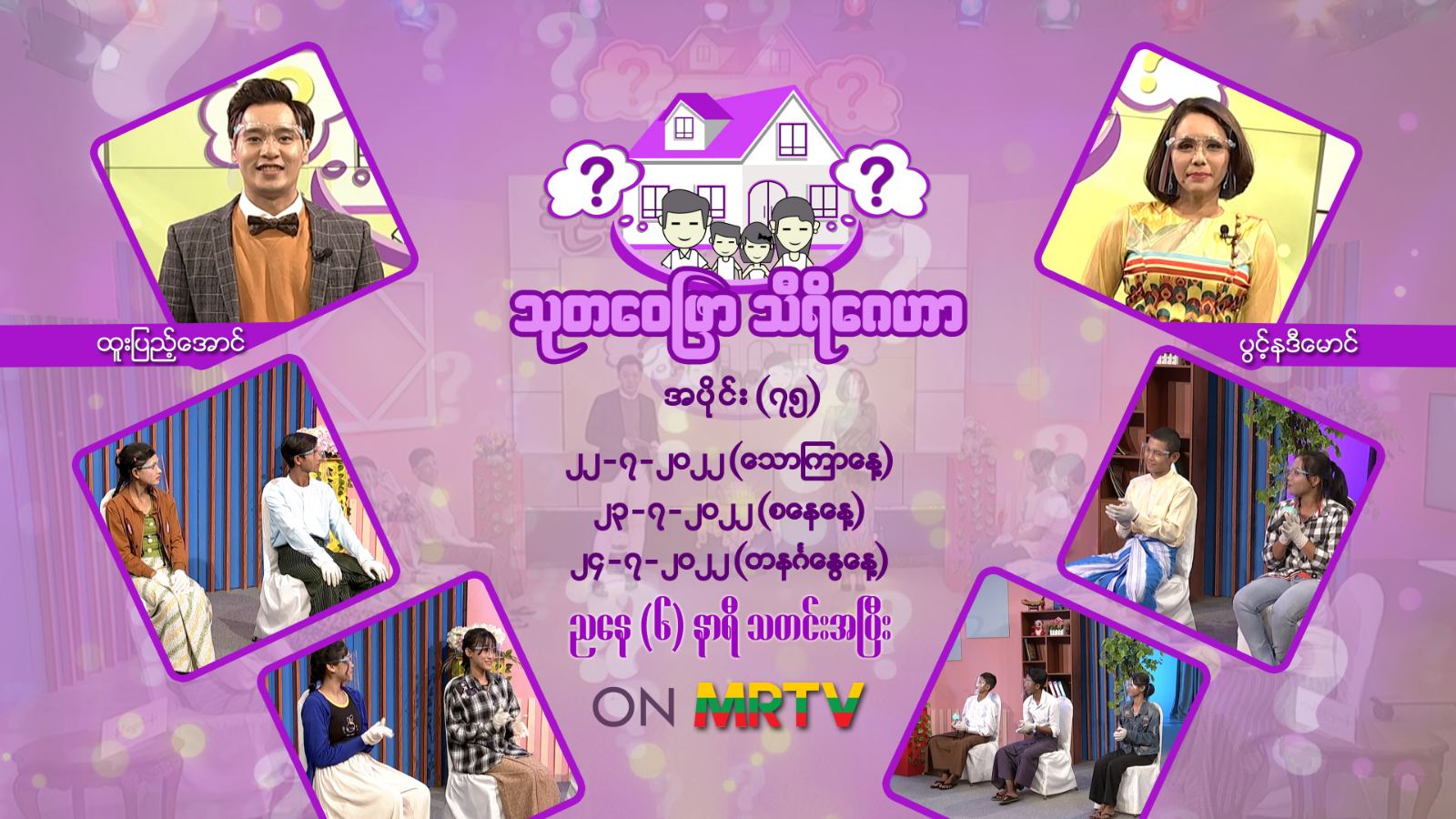 အဆိုပါ ကိုဗစ်- ၁၉ ဆိုင်ရာ အသိပညာမျှဝေမှုအစီအစဉ်ကို အစီအစဉ်တင်ဆက်သူ ‌‌ထူးပြည့်အောင် နှင့် ပွင့်နဒီမောင်တို့က တင်ဆက်ကြမည်ဖြစ်ပြီး  လူရွှင်တော်အသင်းမှ မိသားစုများ ပါဝင်ယှဉ်ပြိုင်ကြမည် ဖြစ်ရာ ယင်းပြိုင်ပွဲများကို ဇူလိုင် ၂၂ ၊ ၂၃ နှင့် ၂၄ ရက်တို့တွင် မြန်မာ့အသံနှင့် ရုပ်မြင်သံကြား၏ MRTV-HD မှ ညနေ ၆ နာရီ သတင်းအပြီးတွင် ထုတ်လွှင့်ပြသသွားမည် ဖြစ်ကြောင်း သိရသည်။
