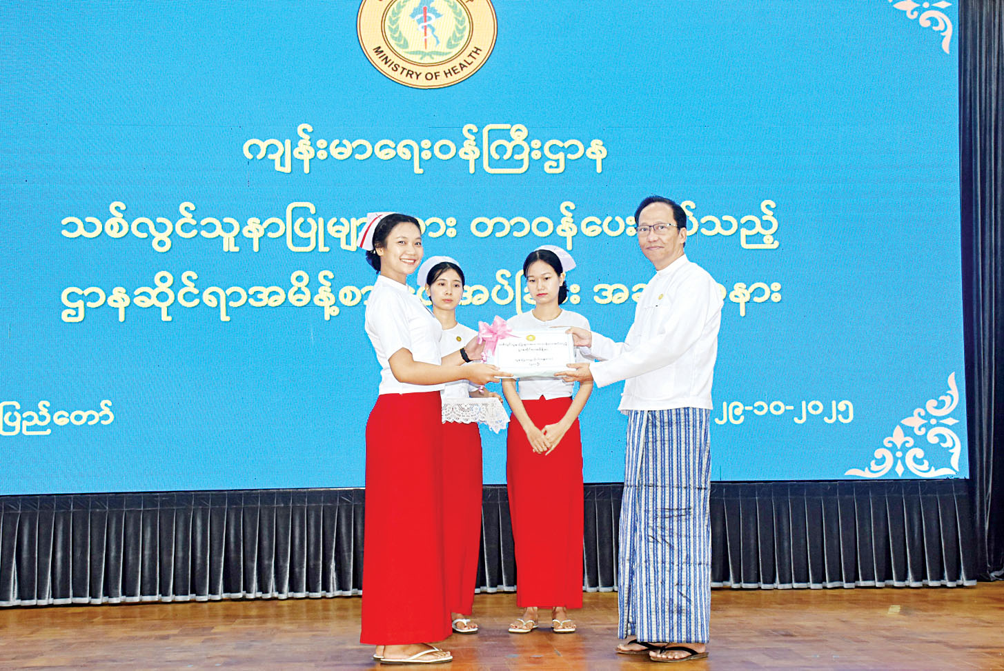 ကျန်းမာရေးဝန်ကြီးဌာနမှ သူနာပြုသိပ္ပံဘွဲ့(ပုံမှန်)အောင်မြင်သော သစ်လွင်သူနာပြုများ တာဝန်ပေးအပ်သည့် ဌာနဆိုင်ရာအမိန့်စာပေးအပ်ခြင်းကို ယနေ့နံနက် ၉ နာရီတွင် ကျန်းမာရေးဝန်ကြီးဌာန ရုံးအမှတ်(၄) နေပြည်တော်၌ ကျင်းပသည်။