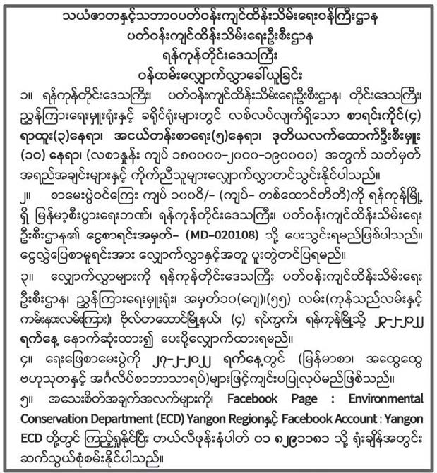 သယံဇာတနှင့် သဘာဝပတ်ဝန်းကျင် ထိန်းသိမ်းရေးဝန်ကြီးဌာန၊ ပတ်ဝန်းကျင် ထိန်းသိမ်းရေးဦးစီးဌာန ရန်ကုန်တိုင်းဒေသကြီးတွင် လျှောက်လွှာခေါ်ယူ