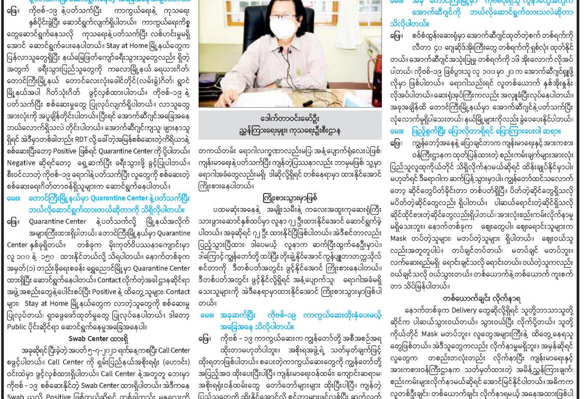 အခုအချိန်မှာ မိမိကိုယ်တိုင်ဆင်ခြင်ဖို့ အဓိကအကြောင်းရင်းဖြစ်ပါတယ်။ သွားလာနေထိုင်တာအကုန်လုံး ပြဌာန်းထားတဲ့ဉပဒေနဲ့အညီ နေထိုင်ဆောင်ရွက်သွားမယ်ဆိုရင် ဒီရောဂါကြီးက ကာကွယ်နိုင်မှာ ဖြစ်ပါတယ်