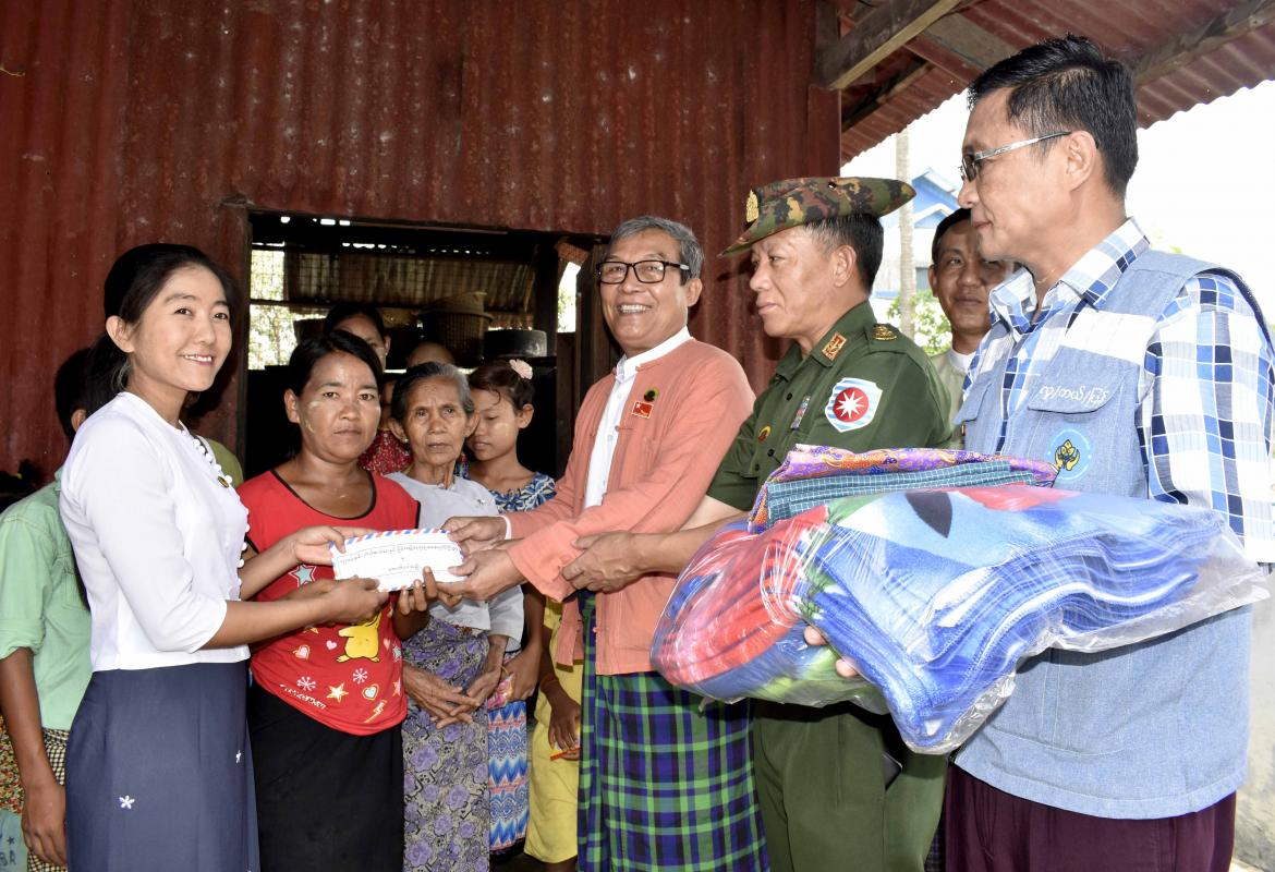 ရခိုင်ပြည်နယ်ဝန်ကြီးချုပ် ဦးညီပု စစ်တွေမြို့သို့ရောက်ရှိလာသည့် နေရပ်စွန့်ခွာပြည်သူများအား ထောက်ပံ့ငွေနှင့် ထောက်ပံ့ပစ္စည်းများပေးအပ်