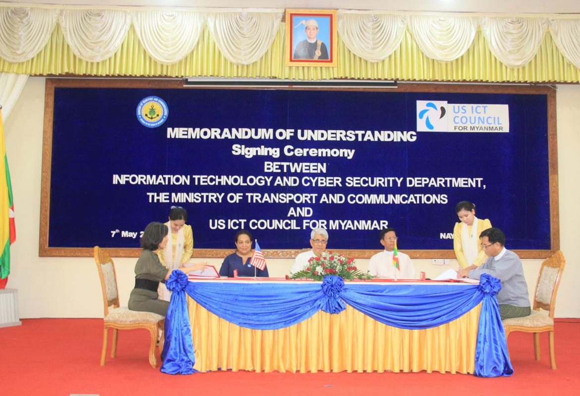 သတင်းအချက်အလက် နည်းပညာနှင့် ဆိုက်ဘာလုံခြုံရေးဦးစီးဌာနနှင့် US ICT Council for Myanmar တို့၏ လူ့စွမ်းအားအရင်းအမြစ် ဖွံ့ဖြိုးတိုးတက်မှုဆိုင်ရာ ပူးပေါင်းဆောင်ရွက်ခြင်း နားလည်မှုစာချွန်လွှာ MOU လက်မှတ်ရေးထိုး