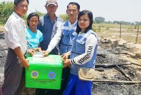 မဂူကျွန်းကျေးရွာမှ မီးဘေးသင့် အိမ်ထောင်စုအား ကယ်ဆယ်ရေးပစ္စည်းများပေးအပ်