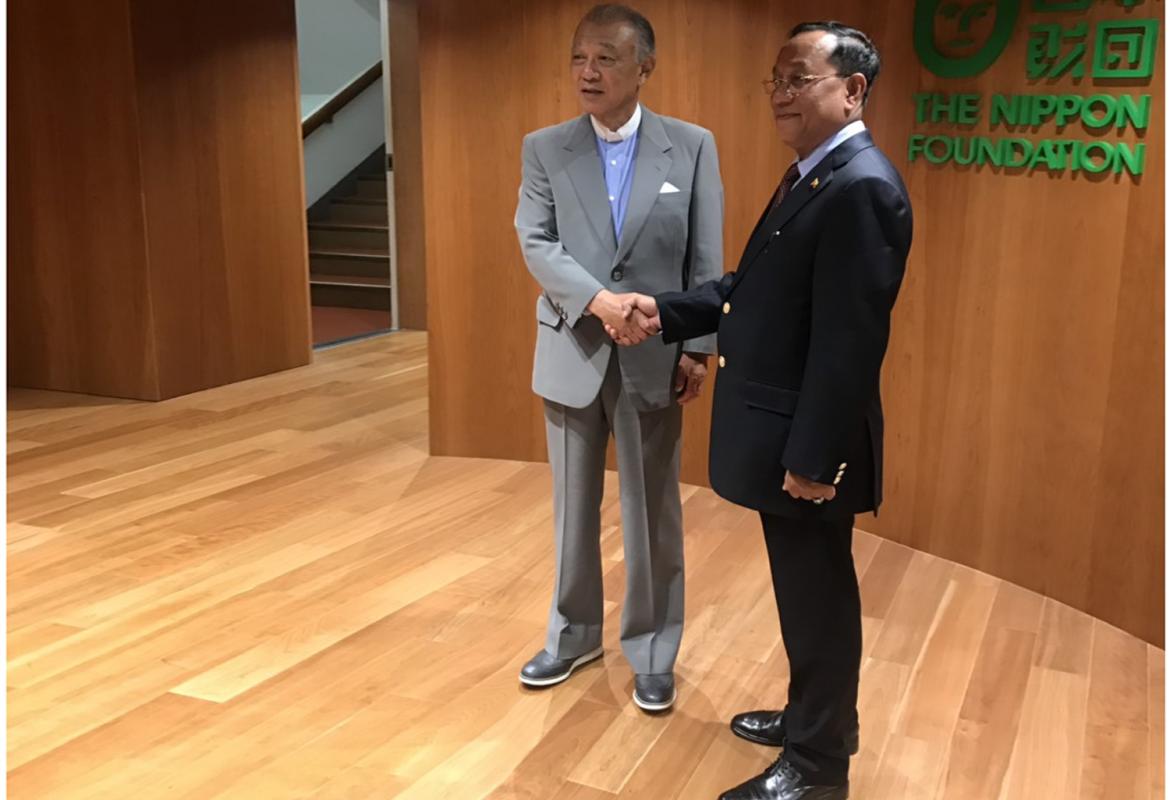 နီပွန်ဖောင်ဒေးရှင်း၏ ဖိတ်ကြားချက်အရ ဂျပန်နိုင်ငံသို့ ရောက်ရှိနေသော နယ်စပ်ရေးရာဝန်ကြီးဌာန၊ ပြည်ထောင်စုဝန်ကြီး ဒုတိယဗိုလ်ချုပ်ကြီး ရဲအောင်နှင့်အဖွဲ့သည်