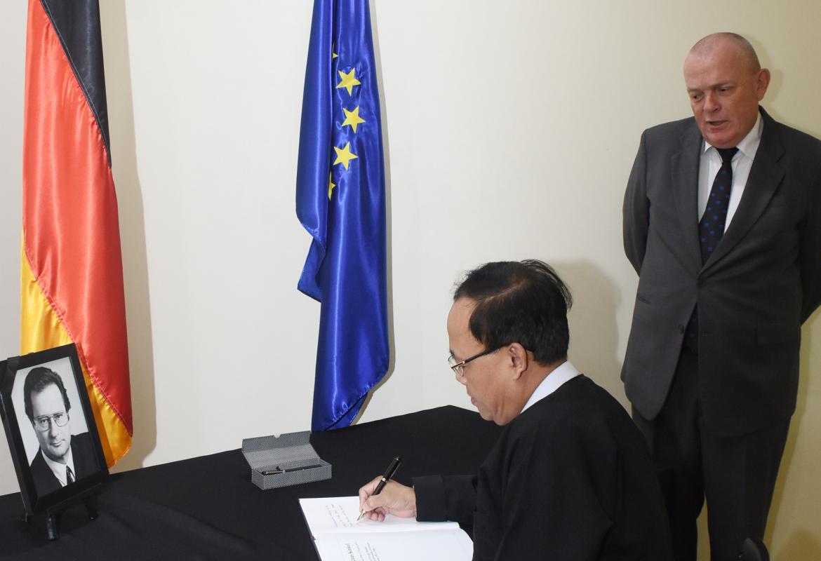 ပြည်ထောင်စုဝန်ကြီး ဦးကျော်တင် ဂျာမနီနိုင်ငံ၏ နိုင်ငံခြားရေးဝန်ကြီးဟောင်း ကွယ်လွန်ခြင်းအတွက် ဝမ်းနည်းခြင်းအထိမ်းအမှတ် လက်မှတ်ရေးထိုး