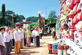 ပြည်ထောင်စုဝန်ကြီး ဦးမောင်မောင်အုန်း (၅၅)ကြိမ်မြောက် တပ်ကုန်းမြို့နယ်လုံးဆိုင်ရာ မဟာဘုံကထိန်ပွဲတော် ဖွင့်ပွဲအခမ်းအနားသို့ တက်ရောက်ပြီး ပဒေသာပင်များလှူဒါန်း ပြင်ဆင်နေမှု ကြည့်ရှုအားပေး