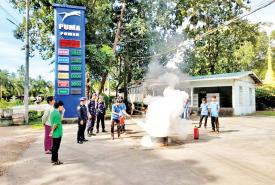 ကျိုက်မရောမြို့နယ် စက်သုံးဆီဆိုင်များ၌ မီးဘေးကြိုတင်ကာကွယ်ရေးစစ်ဆေးပြီး မီးငြှိမ်းသတ်နည်း လက်တွေ့သရုပ်ပြ