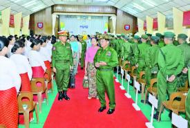 နိုင်ငံတော်လုံခြုံရေးနှင့် အေးချမ်းသာယာရေးကော်မရှင်ဥက္ကဋ္ဌ တပ်မတော်ကာကွယ်ရေးဦးစီးချုပ် ဗိုလ်ချုပ်မှူးကြီး မင်းအောင်လှိုင် တြိဂံဒေသတိုင်းစစ်ဌာနချုပ် နယ်မြေအတွင်း နယ်မြေလုံခြုံရေး ဆောင်ရွက်ထားရှိမှု အခြေအနေများ စစ်ဆေး တပ်နယ်ရှိ အရာရှိ၊ စစ်သည်၊ မိသားစုများအာ