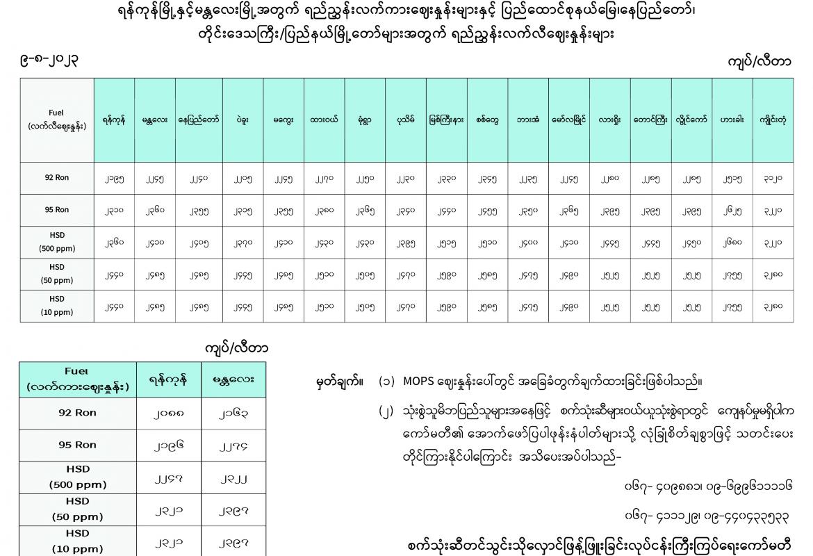ရန်ကုန်မြို့နှင့် မန္တလေးမြို့အတွက် ရည်ညွှန်းလက်ကားဈေးနှုန်းများနှင့် ပြည်ထောင်စုနယ်မြေ နေပြည်တော်၊ တိုင်းဒေသကြီး/ပြည်နယ် မြို့တော်များအတွက် ရည်ညွှန်းလက်လီဈေးနှုန်းများ