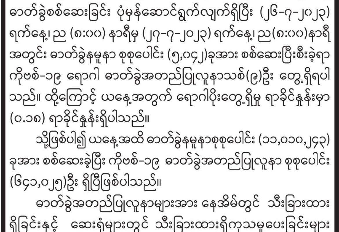 ဓာတ်ခွဲနမူနာစုစုပေါင်း ၅၀၄၂ ခု စစ်ဆေးပြီးစီး ကိုဗစ်-၁၉ ရောဂါ ဓာတ်ခွဲအတည်ပြုလူနာသစ် ကိုးဦး တွေ့ရှိ