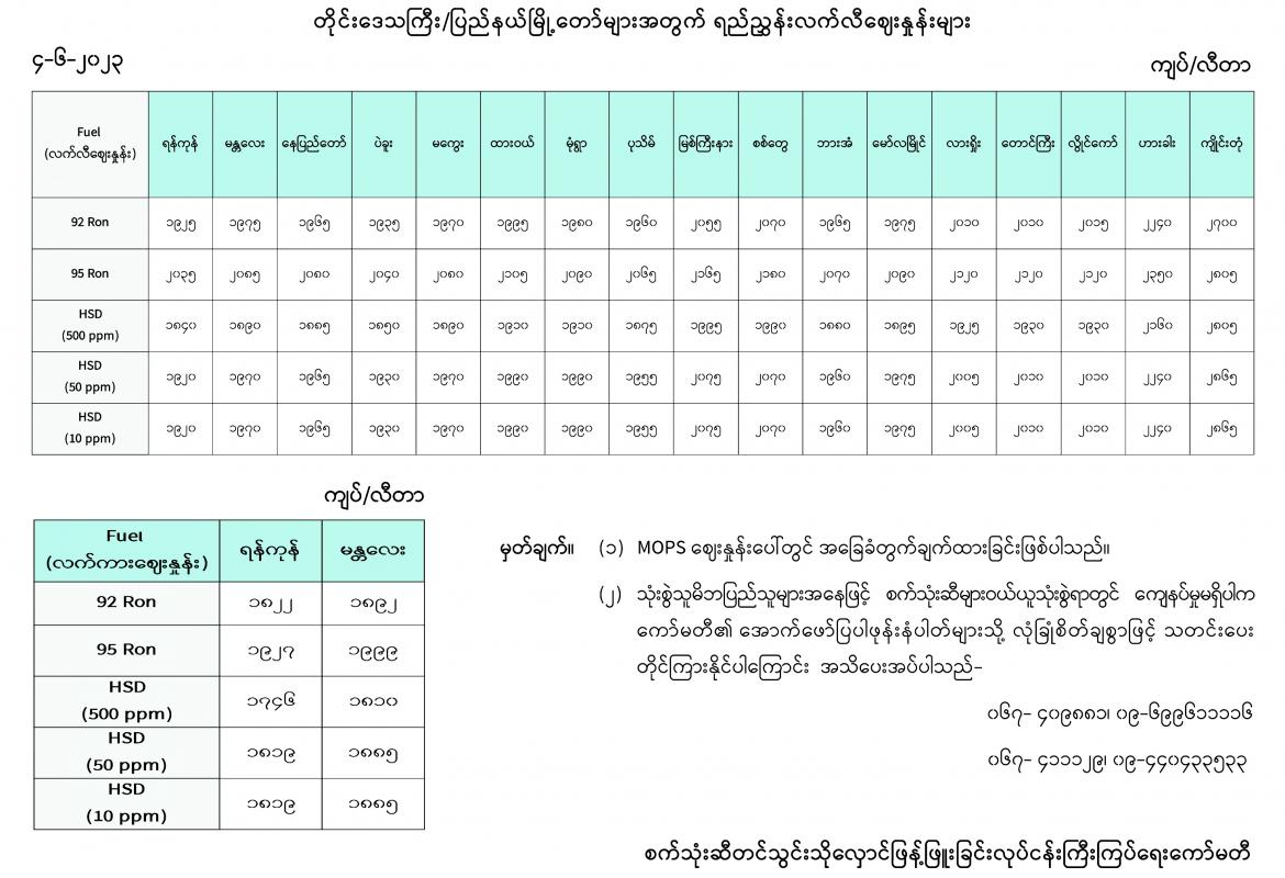 ရန်ကုန်မြို့နှင့် မန္တလေးမြို့အတွက် ရည်ညွှန်းလက်ကားဈေးနှုန်းများနှင့် ပြည်ထောင်စုနယ်မြေ နေပြည်တော်၊ တိုင်းဒေသကြီး/ပြည်နယ် မြို့တော်များအတွက် ရည်ညွှန်းလက်လီဈေးနှုန်းများ