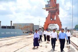 ဒုတိယဝန်ကြီး ဦးအောင်ကျော်ထွန်း ပြည်တွင်းရေကြောင်းပို့ဆောင်ရေးရှိ ဒလသင်္ဘောကျင်း၊ မြန်မာ့သင်္ဘောကျင်းလုပ်ငန်းများနှင့် ရန်ကုန်မြို့ ( TMT) ဆိပ်ကမ်းတံတားမှ ရခိုင်ပြည်နယ် စစ်တွေမြို့သို့ ကူညီကယ်ဆယ်ရေးပစ္စည်းများ တင်ဆောင်နေမှုတို့ကို သွားရောက်ကြည့်ရှုစစ်ဆေး