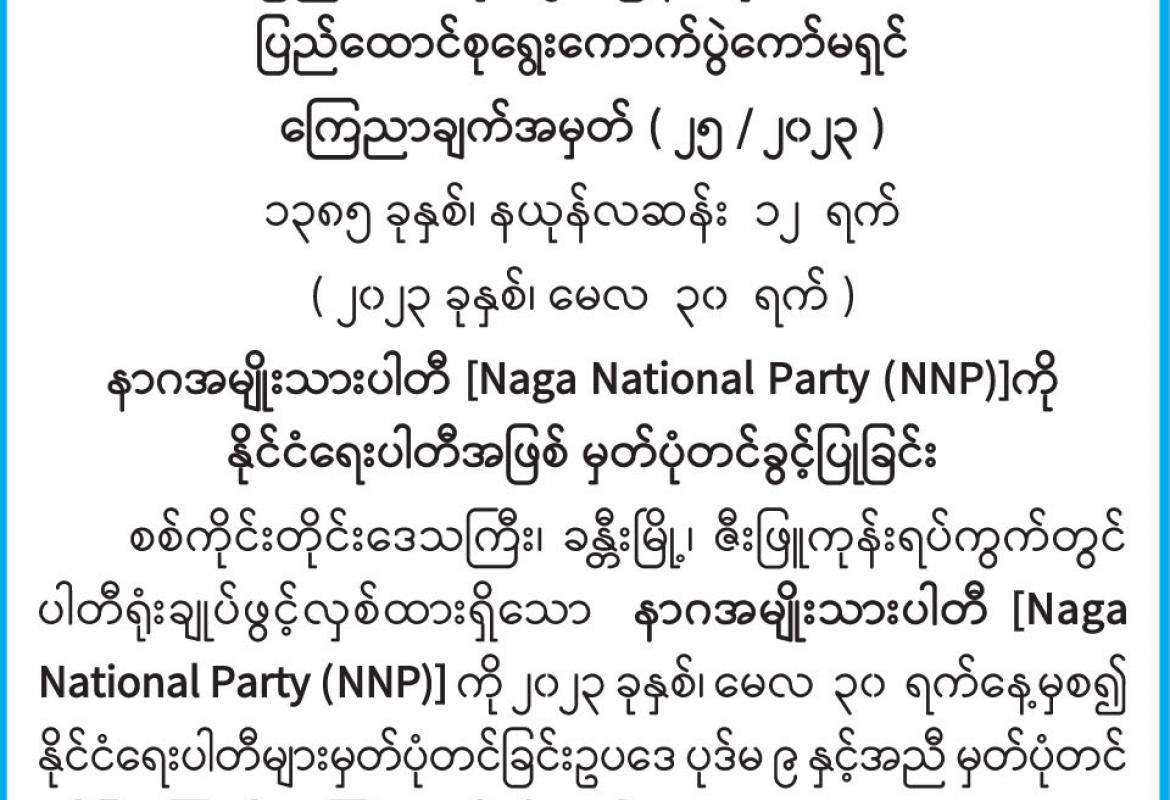 နာဂအမျိုးသားပါတီ (Naga National Party (NN)) ကို နိုင်ငံရေးပါတီအဖြစ် မှတ်ပုံတင်ခွင့်ပြု