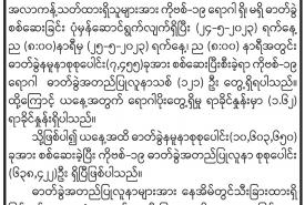 ဓာတ်ခွဲနမူနာစုစုပေါင်း ၇၄၅၅ ခု စစ်ဆေးပြီးစီး၊ ကိုဗစ်-၁၉ ရောဂါ ဓာတ်ခွဲအတည်ပြုလူနာသစ် ၁၂၁ ဦး တွေ့ရှိ