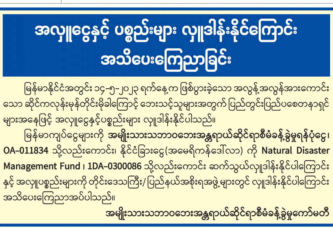 အလှူငွေနှင့် ပစ္စည်းများ လှူဒါန်းနိုင်ကြောင်း အသိပေးကြေညာခြင်း