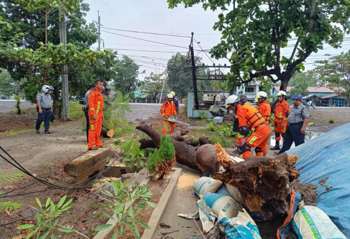 ရခိုင်ပြည်နယ် ဂွမြို့၌ လေပြင်းတိုက်ခတ်မှုကြောင့် ကျိုးပဲ့သည့် သစ်ပင်ကြီးများ၊ သစ်ကိုင်းခက်များအား မြို့နယ်မီးသတ်တပ်ဖွဲ့ဝင်များနှင့် ရဲတပ်ဖွဲ့ဝင်များက ရှင်းလင်း