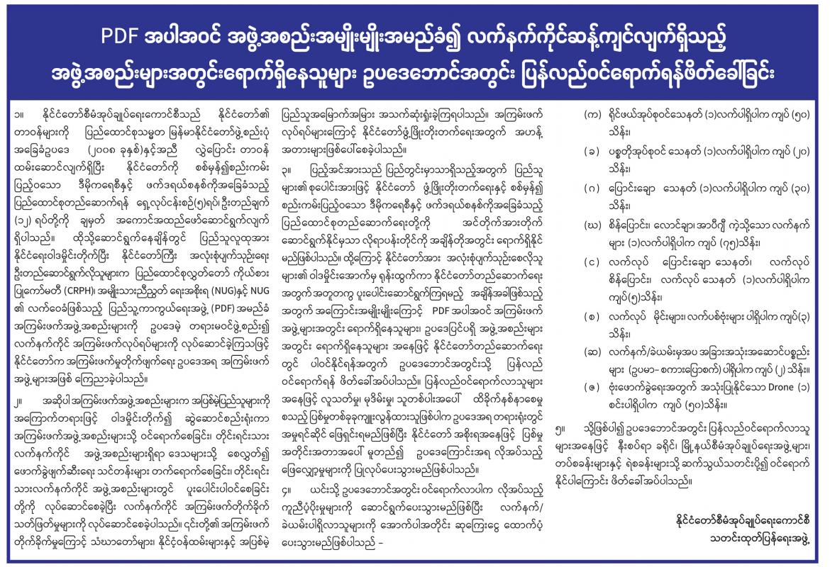 PDF အပါအဝင် အဖွဲ့အစည်းအမျိုးမျိုးအမည်ခံ၍ လက်နက်ကိုင်ဆန့်ကျင်လျက်ရှိသည့် အဖွဲ့အစည်းများအတွင်းရောက်ရှိနေသူများ ဥပဒေဘောင်အတွင်း ပြန်လည်ဝင်ရောက်ရန်ဖိတ်ခေါ်ခြင်း