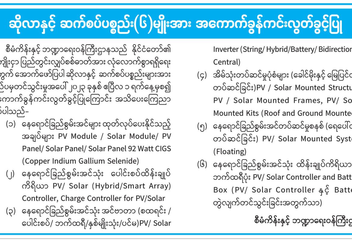 ဆိုလာနှင့် ဆက်စပ်ပစ္စည်း(၆)မျိုးအား အကောက်ခွန်ကင်းလွတ်ခွင့်ပြု