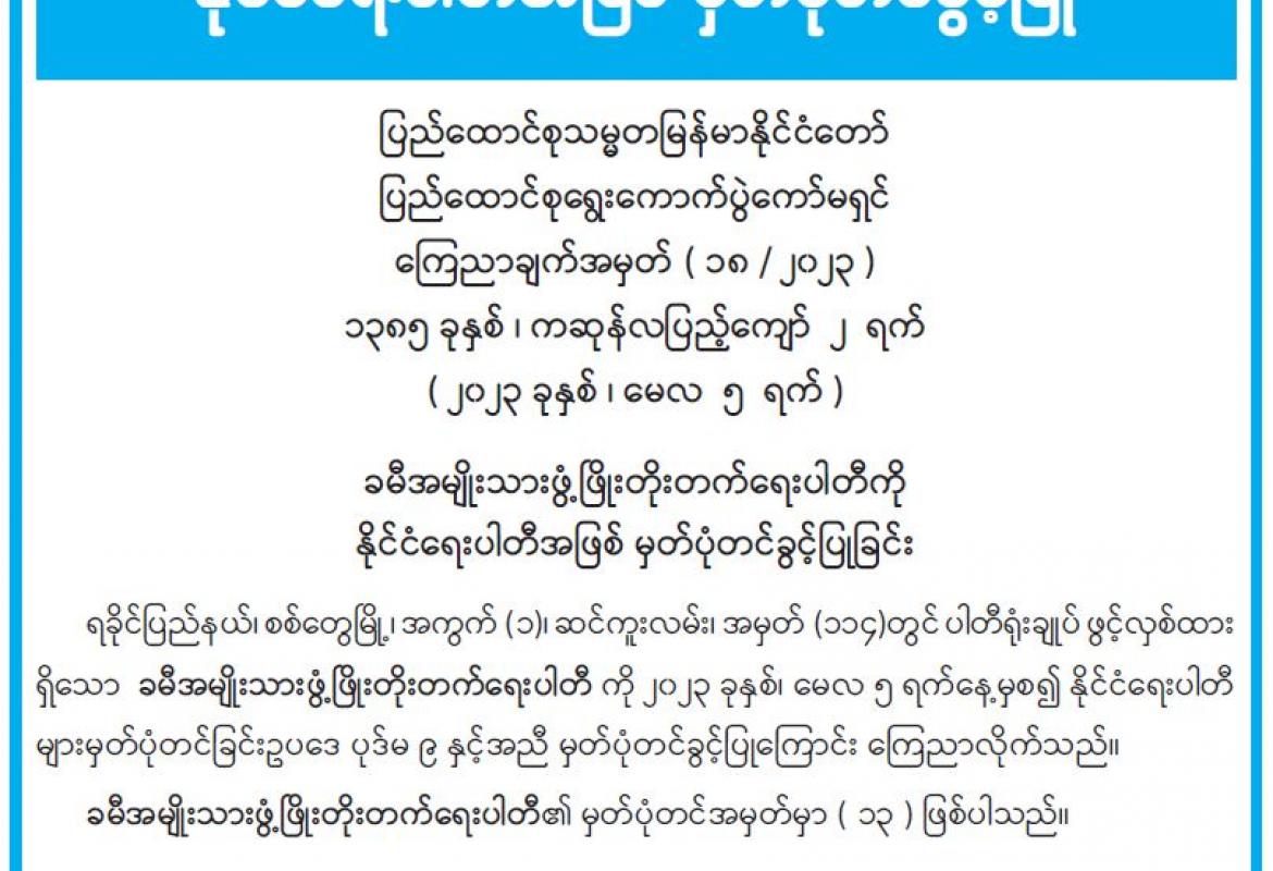 ခမီအမျိုးသားဖွံ့ဖြိုးတိုးတက်ရေးပါတီကို နိုင်ငံရေးပါတီအဖြစ် မှတ်ပုံတင်ခွင့်ပြု