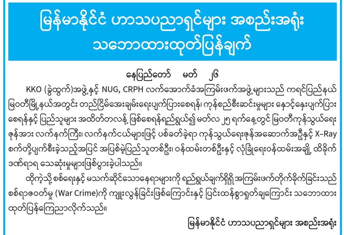 မြန်မာနိုင်ငံ ဟာသပညာရှင်များ အစည်းအရုံး သဘောထားထုတ်ပြန်ချက်