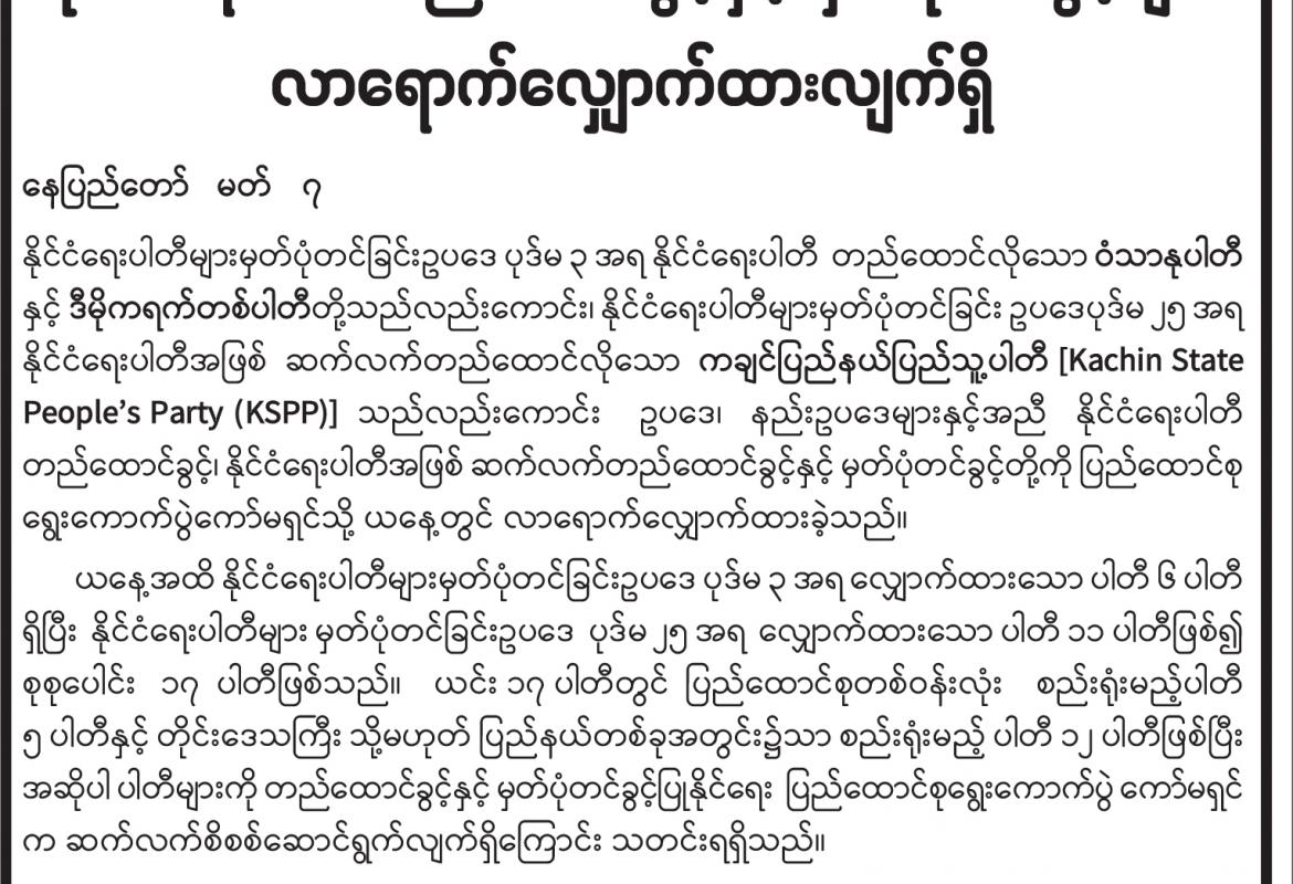 နိုင်ငံရေးပါတီတည်ထောင်ခွင့်နှင့် မှတ်ပုံတင်ခွင့်များ လာရောက်လျှောက်ထားလျက်ရှိ