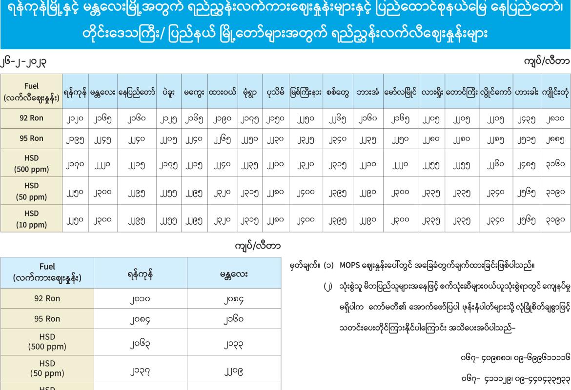 ရန်ကုန်မြို့နှင့် မန္တလေးမြို့အတွက် ရည်ညွှန်းလက်ကားဈေးနှုန်းများနှင့် ပြည်ထောင်စုနယ်မြေ နေပြည်တော်၊ တိုင်းဒေသကြီး/ပြည်နယ် မြို့တော်များအတွက် ရည်ညွှန်းလက်လီဈေးနှုန်းများ