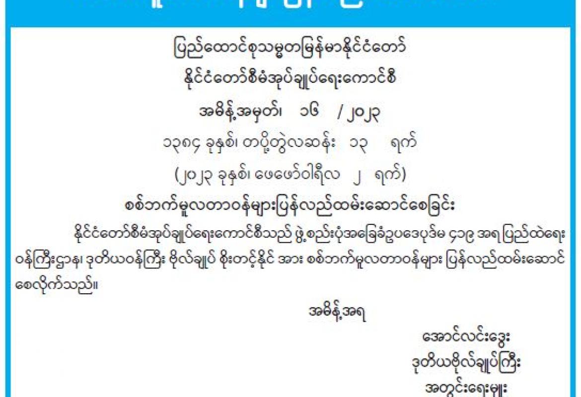 ပဲခူးတိုင်းဒေသကြီးအတွင်းရှိ မြို့နယ်အချို့၌ စစ်အုပ်ချုပ်ရေးအာဏာ ကျင့်သုံးရန် အပ်နှင်း