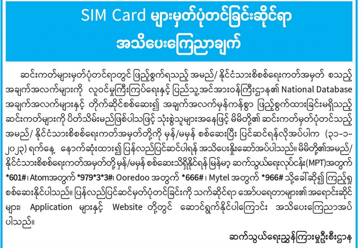 SIM Card များမှတ်ပုံတင်ခြင်းဆိုင်ရာ အသိပေးကြေညာချက်
