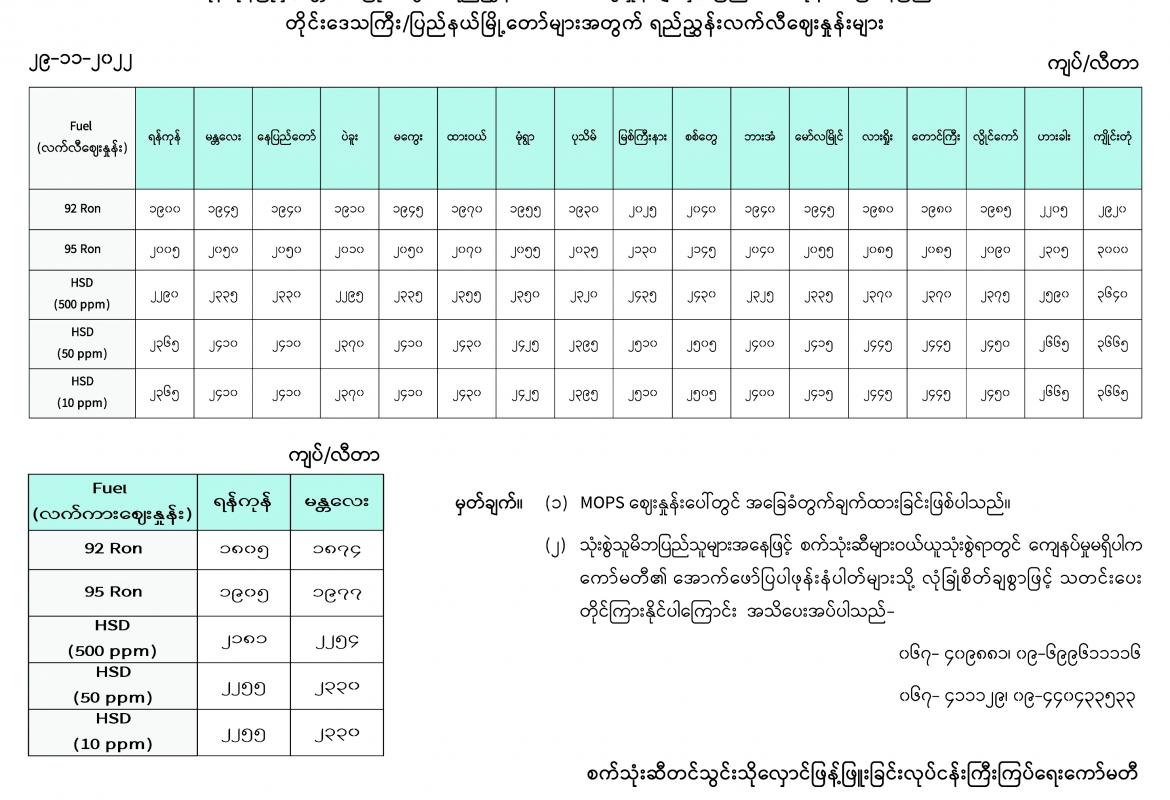 ရန်ကုန်မြို့နှင့် မန္တလေးမြို့အတွက် ရည်ညွှန်းလက်ကားဈေးနှုန်းများနှင့် ပြည်ထောင်စုနယ်မြေ နေပြည်တော်၊ တိုင်းဒေသကြီး/ပြည်နယ် မြို့တော်များအတွက် ရည်ညွှန်းလက်လီဈေးနှုန်းများ