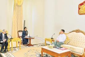 နိုင်ငံတော်စီမံအုပ်ချုပ်ရေးကောင်စီဥက္ကဋ္ဌ နိုင်ငံတော်ဝန်ကြီးချုပ် ဗိုလ်ချုပ်မှူးကြီး မင်းအောင်လှိုင် အိန္ဒိယနိုင်ငံ၊ ပြည်ပရေးရာဝန်ကြီးဌာန၊ နိုင်ငံခြားရေးအတွင်းဝန် H. E. Mr. Vinay Mohan Kwatra အား လက်ခံတွေ့ဆုံ