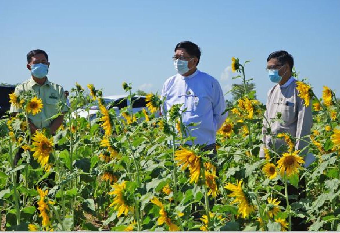 မကွေးတိုင်းဒေသကြီးဝန်ကြီးချုပ် ဦးတင့်လွင် မင်းဘူး(စကု)မြို့နယ်အတွင်း ဆီထွက်သီးနှံ(မိုး)နေကြာ စိုက်ပျိုးအောင်မြင်ဖြစ်ထွန်းနေမှုအား ကွင်းဆင်းကြည့်ရှုစစ်ဆေး